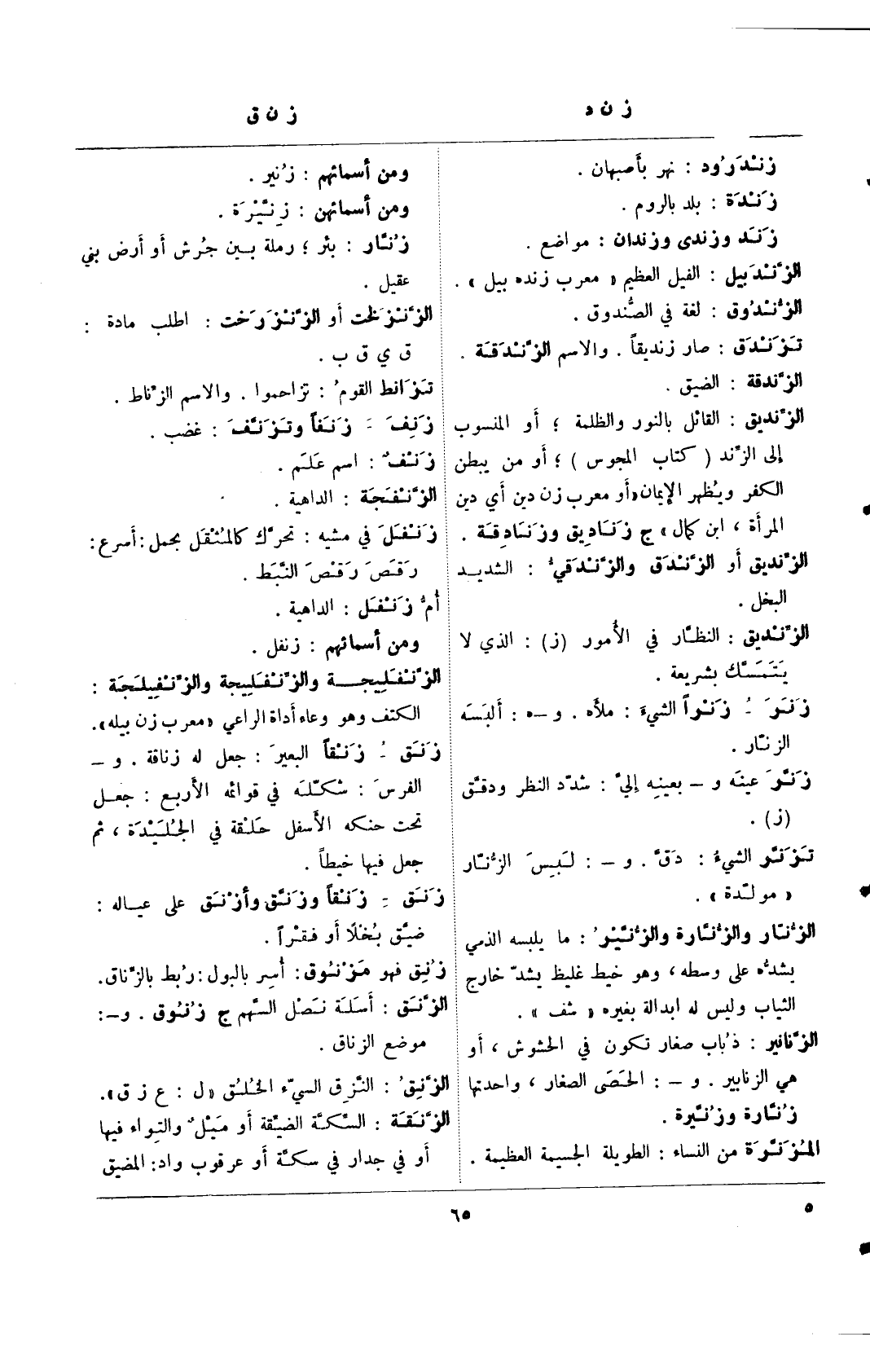 الزنديق: القائل بالنور والظلمة، أو المنسوب إلى الزند (كتاب المجوس)، أو من يبطن الكفر ويظهر الإيمان" (أو معرب زن دين أي دين المرأة، ابن كمل" ج زناديق وزنادقة.