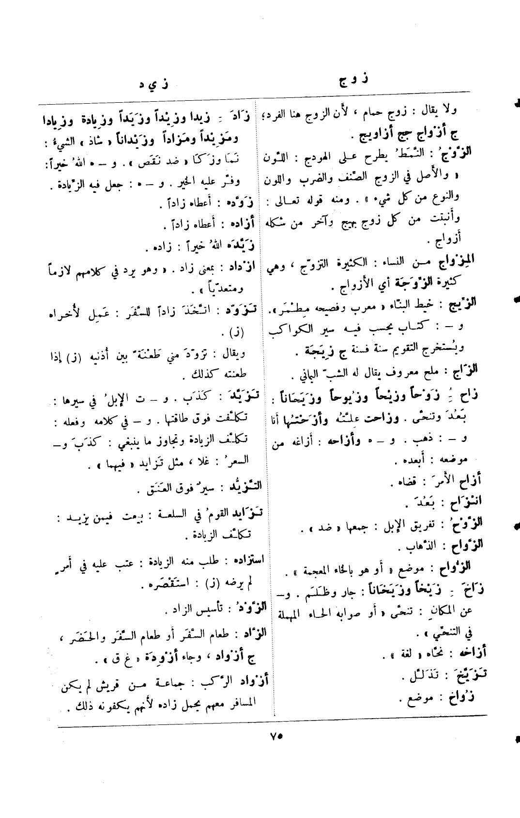 زاد- زيدا وزيدًا وزيدًا وزيادة وزيادا ومزيدًا ومزاًا وزيدانًا "شاذ" الشيء: نما وزكا "ضد نقص". و- هـ الله خيرًا: وفر عليه الخير. و- هـ: جعل فيه الزيادة.