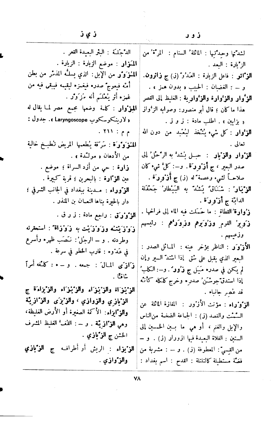 الزوراء: مؤنث الأوزر: المفازة المائلة عن السمت والقصد (ز): الجماعة الضخمة من الناس والإبل والغنم، أو هي ما بين الخمسين إلى الستين: الفلاة البعيدة فيها ازورار (ز). و- من القسي: المعطوفة (ز). و-: مشربة من فضة مستطيلة كالتلتلة: القدح: اسم بغداد: