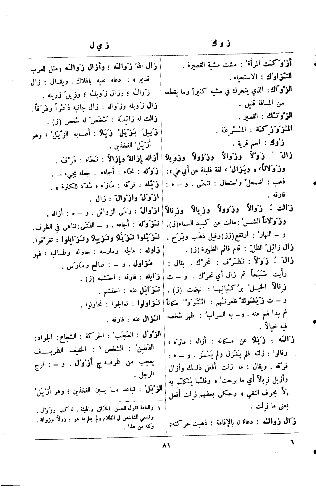 زاله- زيلًا عن مكان: أزاله: مازه، وقالوا: زلته فلم ينزل ولم ينمز. و- هـ: فرقة. ويقال: ما زلت أفعل ذلك وأزال وأزيل زيالًا أي ما برحت"وقلًما يتكلم به إلا بحرف النفي" وحكى بعضهم زلت أفعل بمعنى ما زلت.