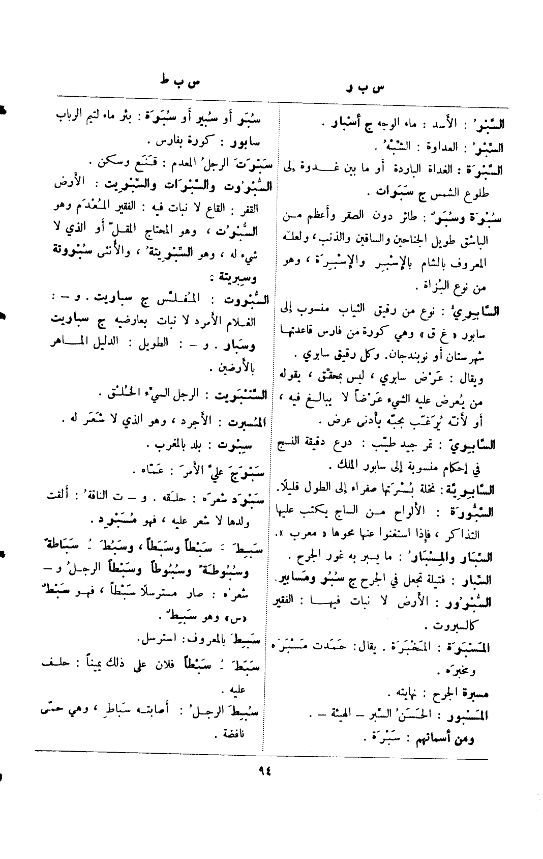 سبرد شعره: حلقه. و- ت الناقة: ألقت ولدها لا شعر عليه، فهو مسبرد. سبط- سبطًا وسبطًا، وسبط – سباطًو وسبوطًة وسبوطًا وسبطًا الرجل و- شعره: صار مسترسلًا سبطًا، فهو سبط "س" وهو سبط.