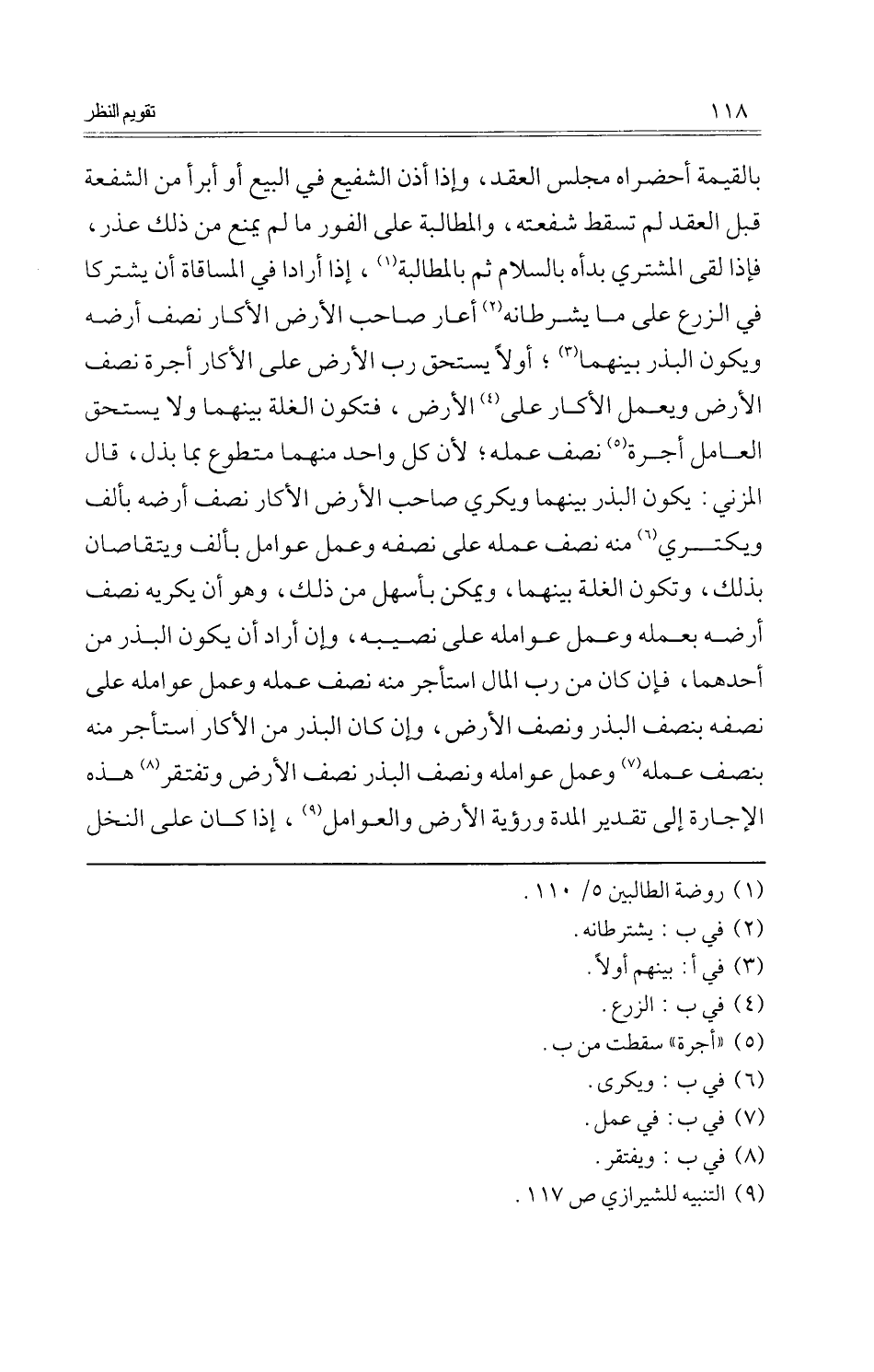 بِالْقيمَةِ أحضراه مجْلِس العقد، وَإِذا أذن الشَّفِيع فِي البيع أَو أَبْرَأ من الشُّفْعَة قبل العقد لم تسْقط شفعته، والمطالبة على الْفَوْر مَا لم يمْنَع من ذَلِك عذر، فَإِذا لَقِي المُشْتَرِي بدأه بِالسَّلَامِ ثمَّ بالمطالبة، إِذا أَرَادَ فِي الْمُسَاقَاة أَن يشتركا فِي الزَّرْع على مَا يشرطانه أعَار صَاحب الأَرْض الأكار نصف أرضه وَيكون الْبذر بَينهمَا؛ أَولا يسْتَحق رب الأَرْض على الأكار أُجْرَة نصف الأَرْض وَيعْمل الأكار على الأَرْض، فَتكون الْغلَّة بَينهمَا وَلَا يسْتَحق الْعَامِل أُجْرَة نصف عمله؛ لِأَن كل وَاحِد مِنْهُمَا مُتَطَوّع بِمَا بذل، قَالَ الْمُزنِيّ: يكون الْبذر بَينهمَا ويكري صَاحب الأَرْض الأكار نصف أرضه بِأَلف ويكتري مِنْهُ نصف عمله على نصفه وَعمل عوامل بِأَلف ويتقاصان بذلك، وَتَكون الْغلَّة بَينهمَا، وَيُمكن بأسهل من ذَلِك، وَهُوَ أَن يكريه نصف أرضه بِعَمَلِهِ وَعمل عوامله على نصِيبه، وَإِن أَرَادَ أَن يكون الْبذر من أَحدهمَا، فَإِن كَانَ من رب المَال اسْتَأْجر مِنْهُ نصف عمله وَعمل عوامله على نصفه بِنصْف الْبذر وَنصف الأَرْض، وَإِن كَانَ الْبذر من الأكار اسْتَأْجر مِنْهُ بِنصْف عمله وَعمل عوامله وَنصف الْبذر نصف الأَرْض وتفتقر هَذِه الْإِجَارَة إِلَى تَقْدِير الْمدَّة ورؤية الأَرْض والعوامل، إِذا كَانَ على النّخل