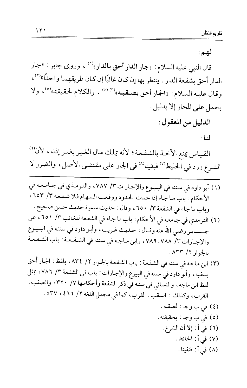 قَالَ النَّبِي عَلَيْهِ السَّلَام: " جَار الدَّار أَحَق بِالدَّار "، وروى جَابر: " جَار الدَّار أَحَق بشفعة الدَّار. ينْتَظر بهَا إِن كَانَ غَائِبا إِن كَانَ طريقهما وَاحِدًا "، وَقَالَ عَلَيْهِ السَّلَام: " الْجَار أَحَق بصقبه "، وَالْكَلَام لحقيقته، وَلَا يحمل على الْمجَاز إِلَّا بِدَلِيل.