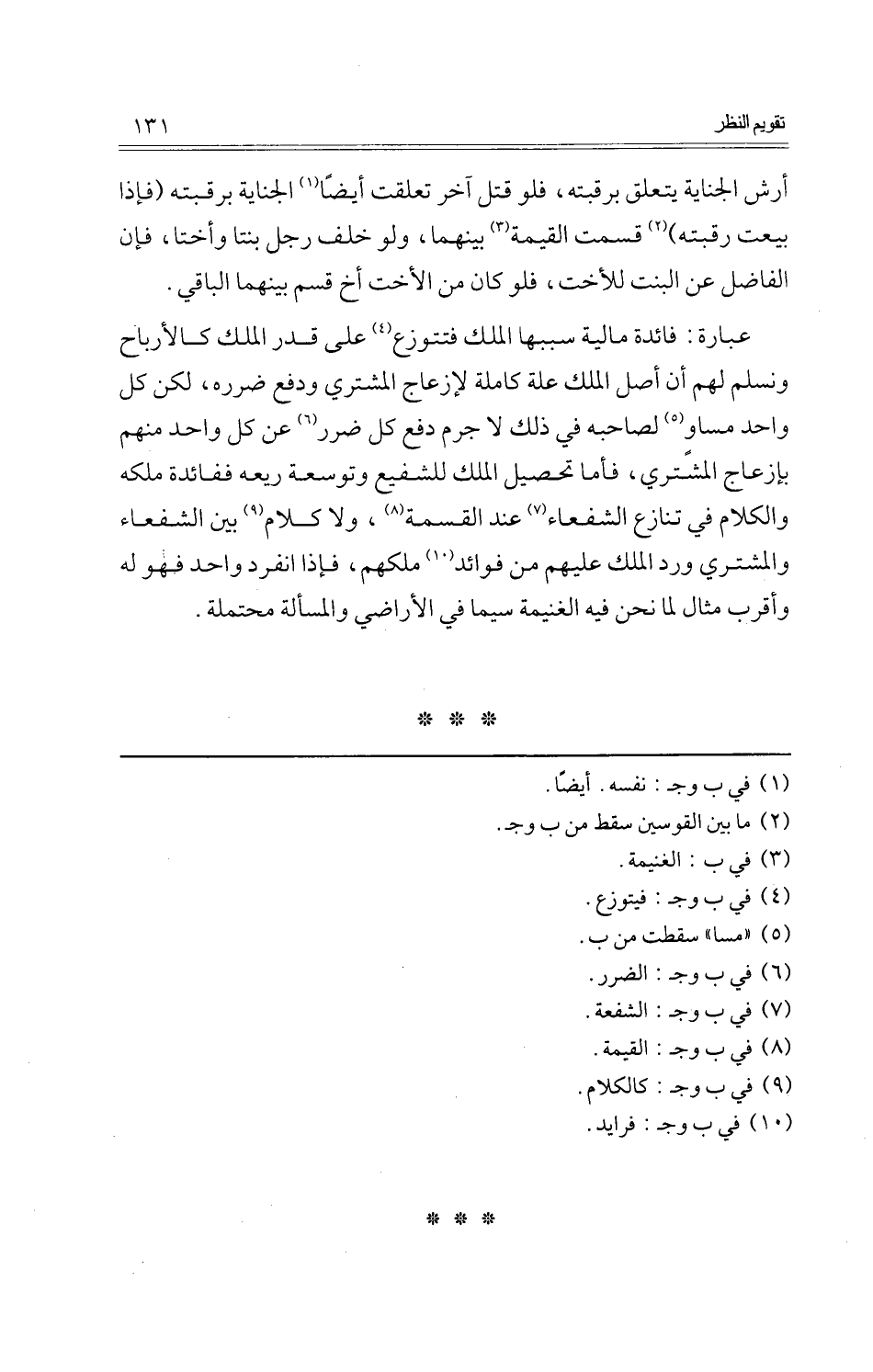 عبارَة: فَائِدَة مَالِيَّة سَببهَا الْملك فتتوزع على قدر الْملك كالأرباح ونسلم لَهُم أَن أصل الْملك عِلّة كَامِلَة لإزعاج المُشْتَرِي وَدفع ضَرَره، لَكِن كل وَاحِد مسَاوٍ لصَاحبه فِي ذَلِك لَا جرم دفع كل ضَرَر عَن كل وَاحِد مِنْهُم بإزعاج المُشْتَرِي، فَأَما تَحْصِيل الْملك للشَّفِيع وتوسعة ريعه ففائدة ملكه وَالْكَلَام فِي تنَازع الشفعاء عِنْد الْقِسْمَة، وَلَا كَلَام بَين الشفعاء وَالْمُشْتَرِي ورد الْملك عَلَيْهِم من فَوَائِد ملكهم، فَإِذا انْفَرد وَاحِد فَهُوَ لَهُ وَأقرب مِثَال لما نَحن فِيهِ الْغَنِيمَة سِيمَا فِي الْأَرَاضِي وَالْمَسْأَلَة مُحْتَملَة.