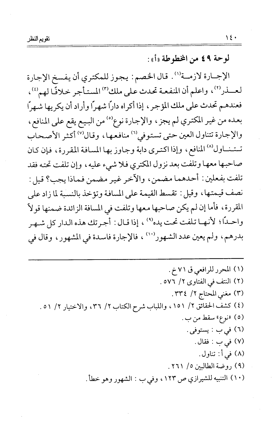 الْإِجَارَة لَازِمَة. قَالَ الْخصم: يجوز للمكتري أَن يفْسخ الْإِجَارَة لعذر، وَاعْلَم أَن الْمَنْفَعَة تحدث على ملك الْمُسْتَأْجر خلافًا لَهُم، فعندهم تحدث على ملك الْمُؤَجّر، إِذا أكراه دَارا شهرا وَأَرَادَ أَن يكريها شهرا بعده من غير الْمُكْتَرِي لم يجز، وَالْإِجَارَة نوع من البيع يَقع على الْمَنَافِع، وَالْإِجَارَة تتَنَاوَل الْعين حَتَّى تستوفي مَنَافِعهَا، وَقَالَ أَكثر الْأَصْحَاب تتَنَاوَل الْمَنَافِع، وَإِذا اكترى دَابَّة وَجَاوَزَ بهَا الْمسَافَة المقررة، فَإِن كَانَ صَاحبهَا مَعهَا وَتَلفت بعد نزُول الْمُكْتَرِي فَلَا شَيْء عَلَيْهِ، وَإِن تلفت تَحْتَهُ فقد تلفت بفعلين: أَحدهمَا مضمن، وَالْآخر غير مضمن فَمَاذَا يجب؟ قيل: نصف قيمتهَا، وَقيل: تسْقط الْقيمَة على الْمسَافَة وَتُؤْخَذ بِالنِّسْبَةِ لما زَاد على المقررة، فَأَما إِن لم يكن صَاحبهَا مَعهَا وَتَلفت فِي الْمسَافَة الزَّائِدَة ضمنهَا قولا وَاحِدًا؛ لِأَنَّهَا تلفت تَحت يَده، إِذا قَالَ: أجرتك هَذِه الدَّار كل شهر بدرهم، وَلم يعين عدد الشُّهُور، فَالْإِجَارَة فَاسِدَة فِي الْمَشْهُور، وَقَالَ فِي