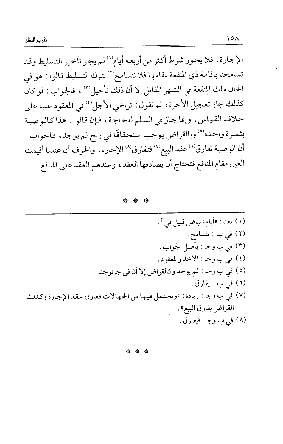 الْإِجَارَة، فَلَا يجوز شَرط أَكثر من أَرْبَعَة أَيَّام لم يجز تَأْخِير التسليط وَقد تسامحنا بِإِقَامَة ذِي الْمَنْفَعَة مقَامهَا فَلَا نتسامح بترك التسليط قَالُوا: هُوَ فِي الْحَال ملك الْمَنْفَعَة فِي الشَّهْر الْمُقَابل إِلَّا أَن ذَلِك تَأْجِيل، فَالْجَوَاب: لَو كَانَ كَذَلِك جَازَ تَعْجِيل الْأُجْرَة، ثمَّ نقُول: تراخي الْأَجَل فِي الْمَعْقُود عَلَيْهِ على خلاف الْقيَاس، وَإِنَّمَا جَازَ فِي السّلم للْحَاجة، فَإِن قَالُوا: هَذَا كَالْوَصِيَّةِ بثمرة وَاحِدَة وبالقراض يُوجب استحقاقا فِي ربح لم يُوجد، فَالْجَوَاب: أَن الْوَصِيَّة تفارق عقد البيع فتفارق الْإِجَارَة، والحرف أَن عندنَا أُقِيمَت الْعين مقَام الْمَنَافِع فتحتاج أَن يصادفها العقد، وَعِنْدهم العقد على الْمَنَافِع.