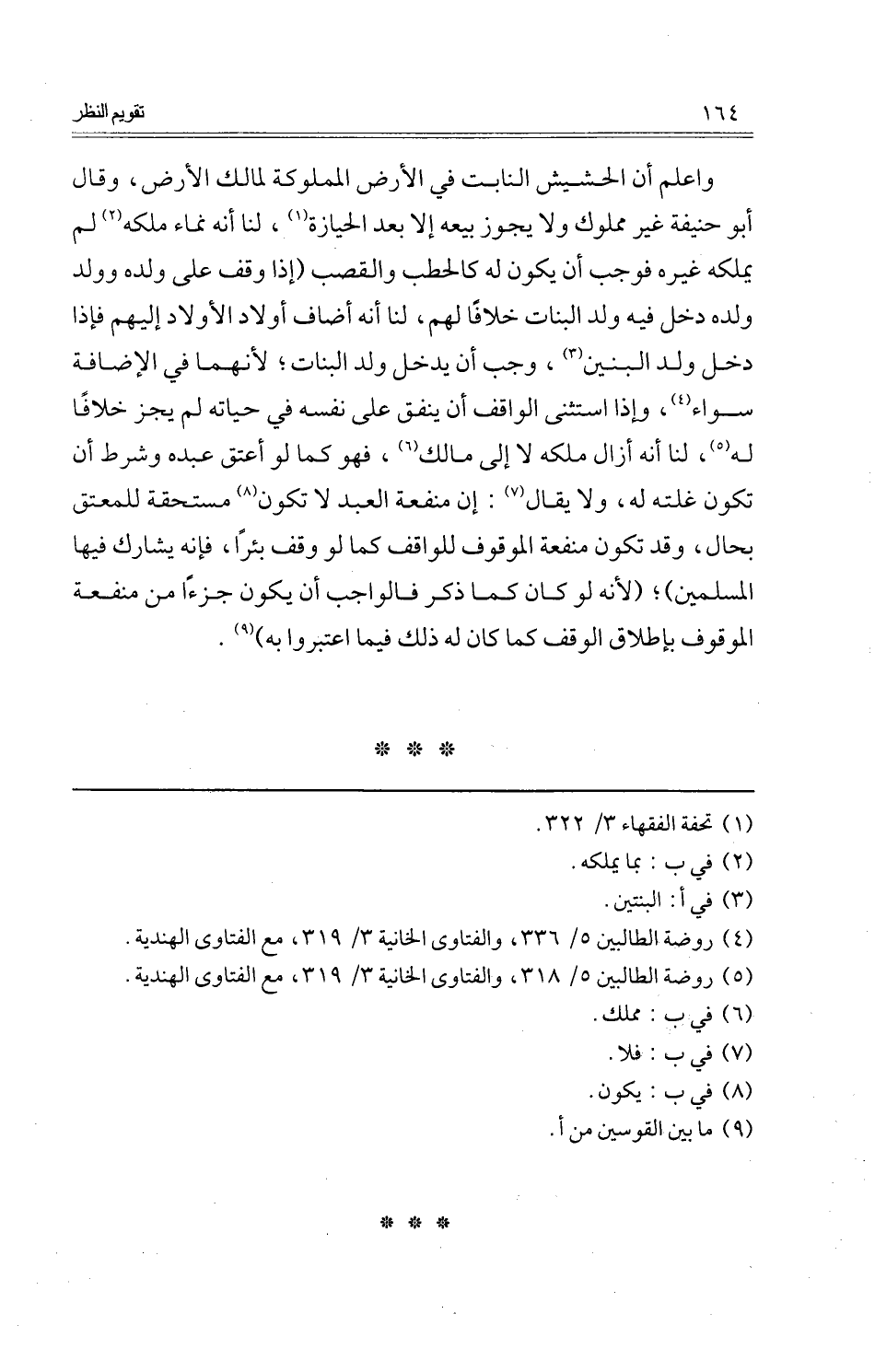 وَاعْلَم أَن الْحَشِيش النَّابِت فِي الأَرْض الْمَمْلُوكَة لمَالِك الأَرْض، وَقَالَ أَبُو حنيفَة غير مَمْلُوك وَلَا يجوز بَيْعه إِلَّا بعد الْحِيَازَة، لنا أَنه نَمَاء ملكه لم يملكهُ غَيره فَوَجَبَ أَن يكون لَهُ كالحطب والقصب (إِذا وقف على وَلَده وَولد وَلَده دخل فِيهِ ولد الْبَنَات خلافًا لَهُم، لنا أَنه أضَاف أَوْلَاد الْأَوْلَاد إِلَيْهِم فَإِذا دخل ولد الْبَنِينَ، وَجب أَن يدْخل ولد الْبَنَات؛ لِأَنَّهُمَا فِي الْإِضَافَة سَوَاء، وَإِذا اسْتثْنى الْوَاقِف أَن ينْفق على نَفسه فِي حَيَاته لم يجز خلافًا لَهُ، لنا أَنه أَزَال ملكه لَا إِلَى مَالك، فَهُوَ كَمَا لَو أعتق عَبده وَشرط أَن تكون غَلَّته لَهُ، وَلَا يُقَال: إِن مَنْفَعَة العَبْد لَا تكون مُسْتَحقَّة للْمُعْتق بِحَال، وَقد تكون مَنْفَعَة الْمَوْقُوف للْوَاقِف كَمَا لَو وقف بِئْرا، فَإِنَّهُ يُشَارك فِيهَا الْمُسلمين) ؛ (لِأَنَّهُ لَو كَانَ كَمَا ذكر فَالْوَاجِب أَن يكون جُزْءا من مَنْفَعَة الْمَوْقُوف بِإِطْلَاق الْوَقْف كَمَا كَانَ لَهُ ذَلِك فِيمَا اعتبروا بِهِ) .