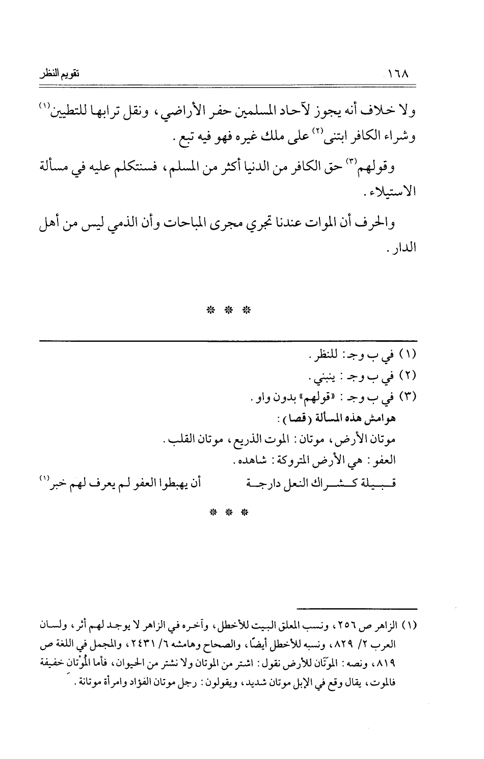 والحرف أَن الْموَات عندنَا تجْرِي مجْرى الْمُبَاحَات وَأَن الذِّمِّيّ لَيْسَ من أهل الدَّار.