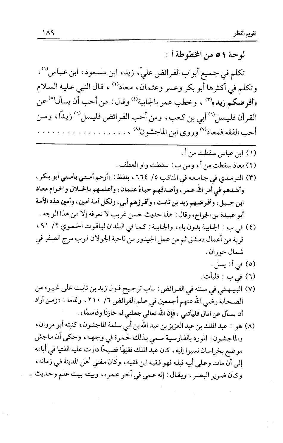 تكلم فِي جَمِيع أَبْوَاب الْفَرَائِض عَليّ، زيد، ابْن مَسْعُود، ابْن عَبَّاس، وَتكلم فِي أَكْثَرهَا أَبُو بكر وَعمر وَعُثْمَان، معَاذ، قَالَ النَّبِي عَلَيْهِ السَّلَام " أفرضكم زيد "، وخطب عمر بالجابية وَقَالَ: من أحب أَن يسْأَل عَن الْقُرْآن فليسل أبي بن كَعْب، وَمن أحب الْفَرَائِض فليسل زيدا، وَمن أحب الْفِقْه فمعاذ وروى ابْن الْمَاجشون، ... ... ... ... ... ... ... ... ...