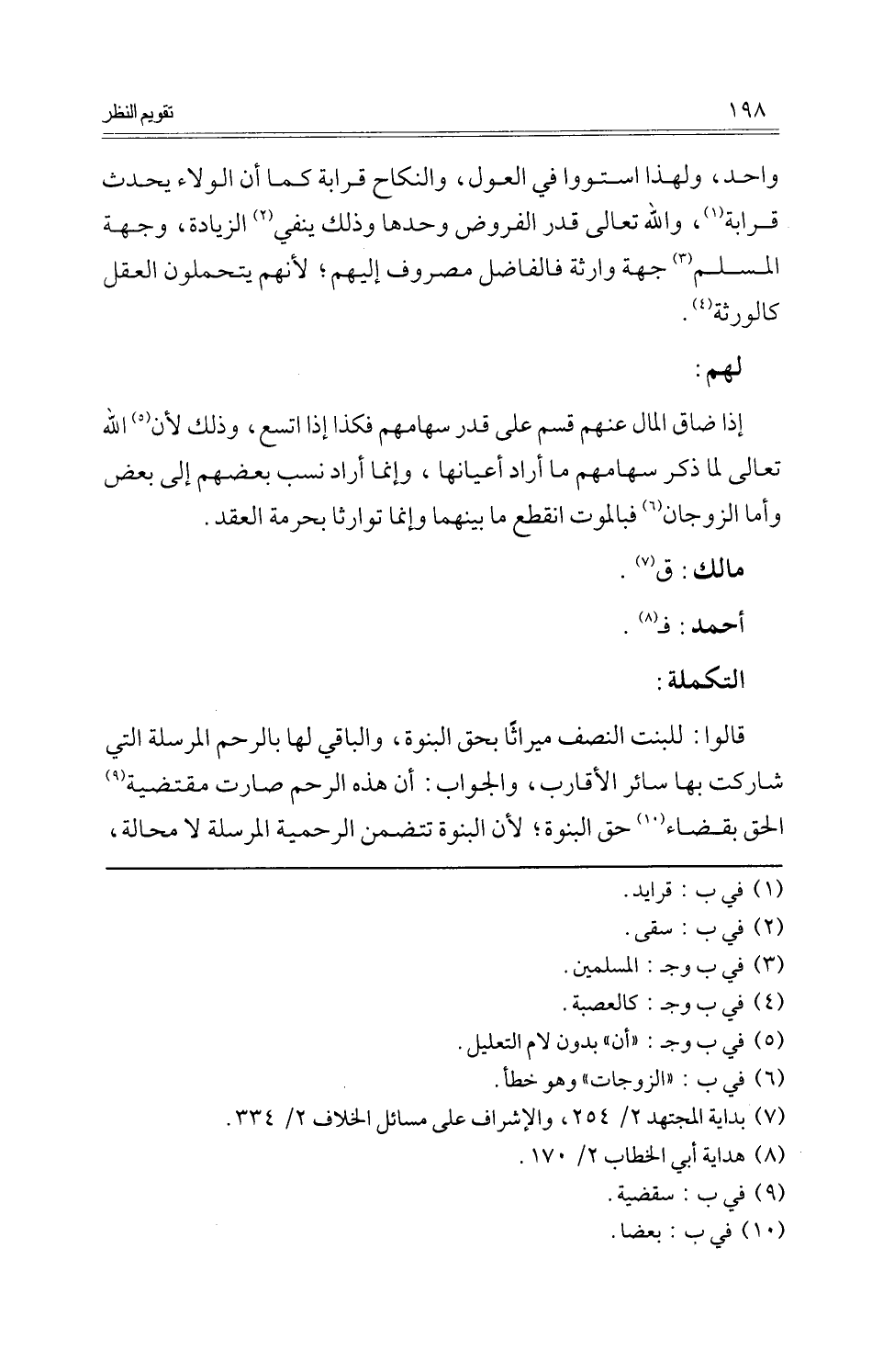 وَاحِد، وَلِهَذَا اسْتَووا فِي الْعَوْل، وَالنِّكَاح قرَابَة كَمَا أَن الْوَلَاء يحدث قرَابَة، وَالله تَعَالَى قدر الْفُرُوض وَحدهَا وَذَلِكَ يَنْفِي الزِّيَادَة، وجهة الْمُسلم جِهَة وارثة فالفاضل مَصْرُوف إِلَيْهِم؛ لأَنهم يتحملون الْعقل كالورثة.