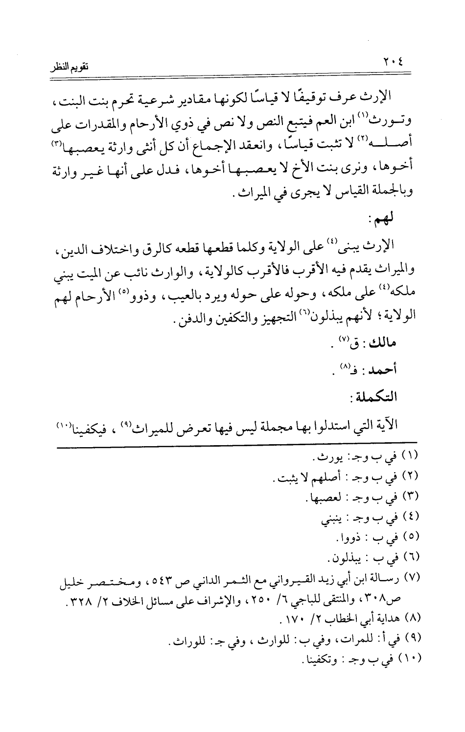 الْإِرْث عرف توقيفا لَا قِيَاسا لكَونهَا مقادير شَرْعِيَّة تحرم بنت الْبِنْت، وتورث ابْن الْعم فَيتبع النَّص وَلَا نَص فِي ذَوي الْأَرْحَام والمقدرات على أَصله لَا تثبت قِيَاسا، وانعقد الْإِجْمَاع أَن كل أُنْثَى وارثة يعصبها أَخُوهَا، ونرى بنت الْأَخ لَا يعصبها أَخُوهَا، فَدلَّ على أَنَّهَا غير وارثة وَبِالْجُمْلَةِ الْقيَاس لَا يجرى فِي الْمِيرَاث.