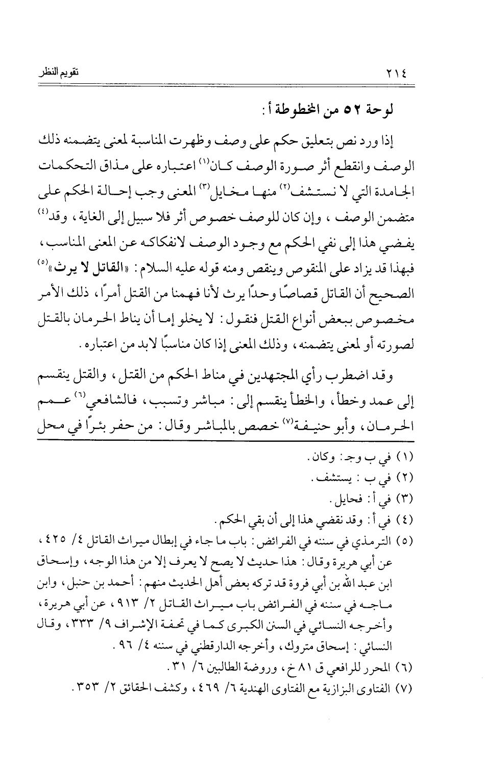 وَقد اضْطربَ رَأْي الْمُجْتَهدين فِي منَاط الحكم من الْقَتْل، وَالْقَتْل يَنْقَسِم إِلَى عمد وَخطأ، وَالْخَطَأ يَنْقَسِم إِلَى: مبَاشر وتسبب، فالشافعي عمم الحرمان، وَأَبُو حنيفَة خصص بالمباشر وَقَالَ: من حفر بِئْرا فِي مَحل