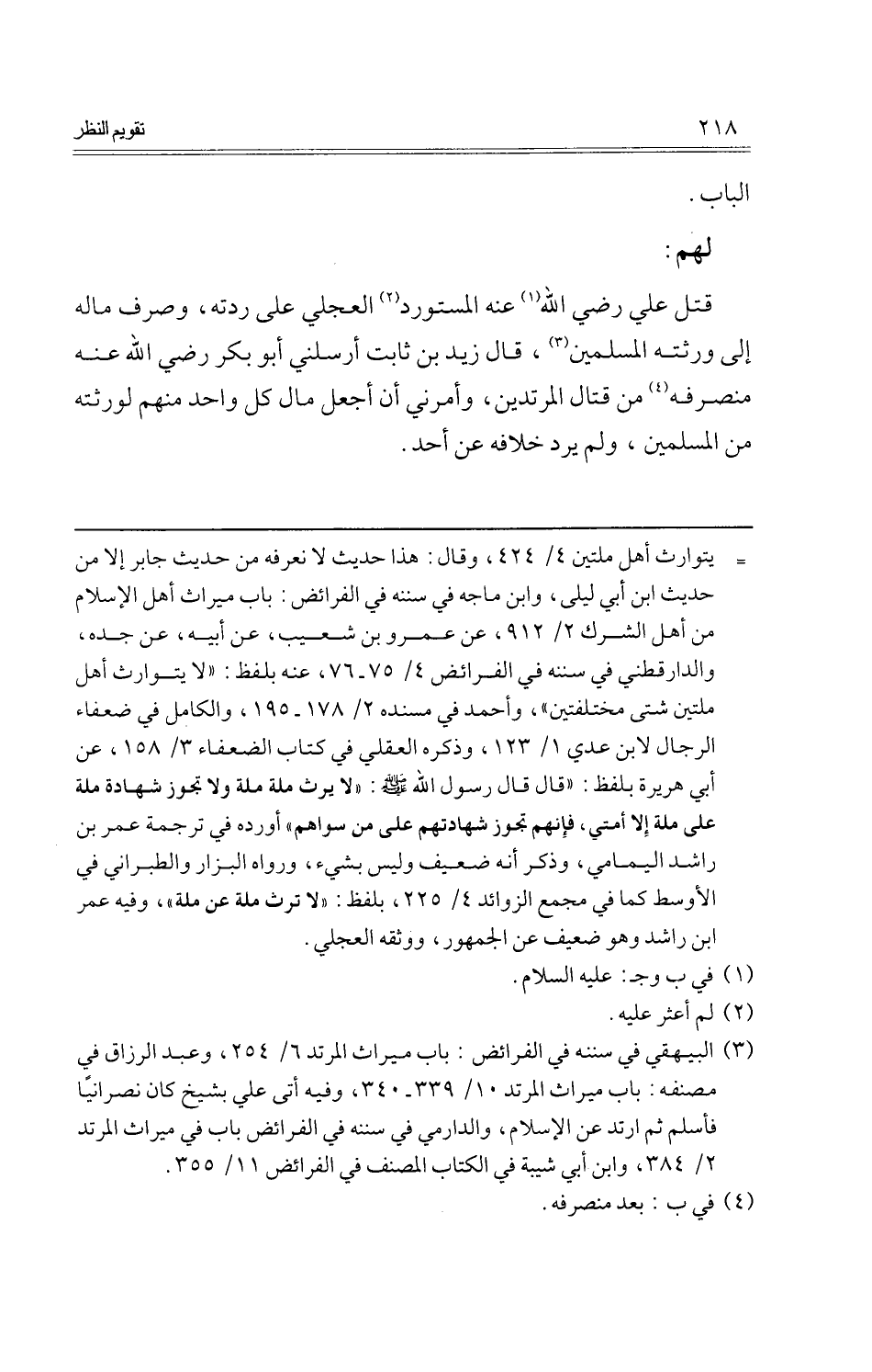 قتل عَليّ رَضِي الله عَنهُ الْمُسْتَوْرد الْعجلِيّ على ردته، وَصرف مَاله إِلَى ورثته الْمُسلمين، قَالَ زيد بن ثَابت أَرْسلنِي أَبُو بكر رَضِي الله عَنهُ مُنْصَرفه من قتال الْمُرْتَدين، وَأَمرَنِي أَن أجعَل مَال كل وَاحِد مِنْهُم لوَرثَته من الْمُسلمين، وَلم يرد خِلَافه عَن أحد.