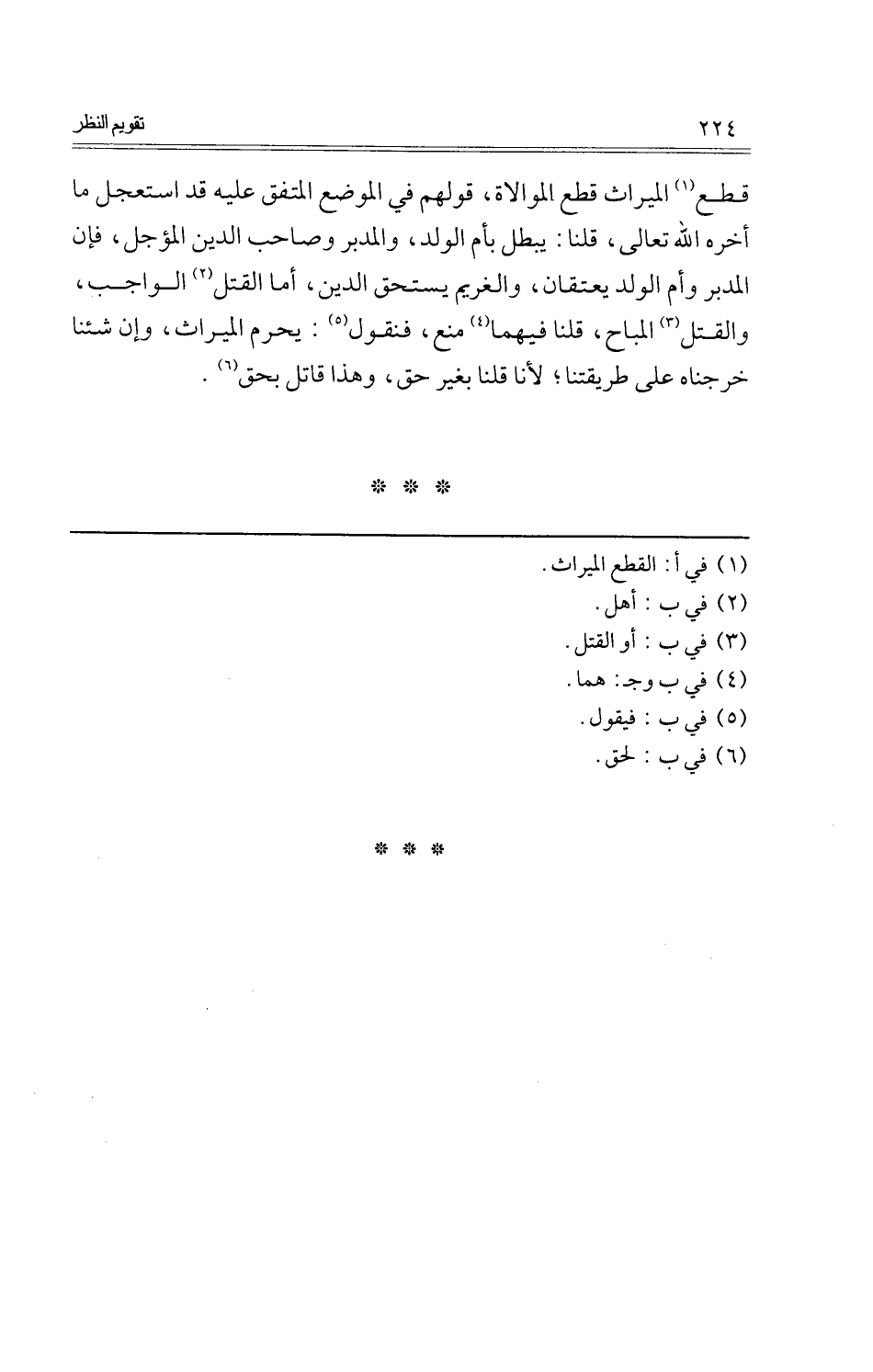 قطع الْمِيرَاث قطع الْمُوَالَاة، قَوْلهم فِي الْموضع الْمُتَّفق عَلَيْهِ قد استعجل مَا أَخّرهُ الله تَعَالَى، قُلْنَا: يبطل بِأم الْوَلَد، وَالْمُدبر وَصَاحب الدّين الْمُؤَجل، فَإِن الْمُدبر وَأم الْوَلَد يعتقان، والغريم يسْتَحق الدّين، أما الْقَتْل الْوَاجِب، وَالْقَتْل الْمُبَاح، قُلْنَا فيهمَا منع، فَنَقُول: يحرم الْمِيرَاث، وَإِن شِئْنَا خرجناه على طريقتنا؛ لأَنا قُلْنَا بِغَيْر حق، وَهَذَا قَاتل بِحَق.