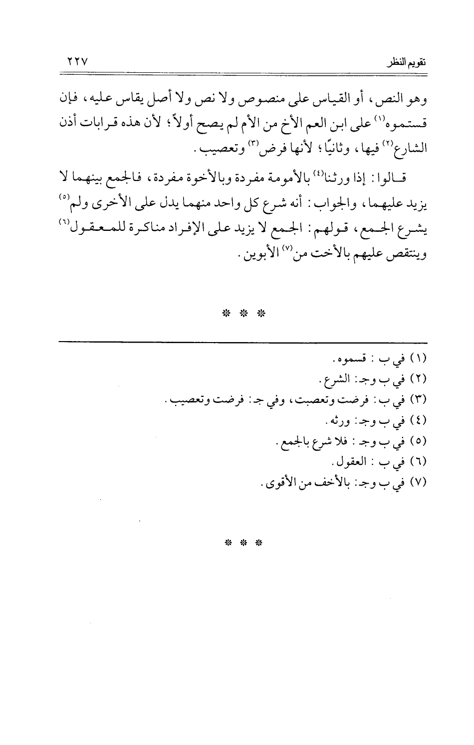 وَهُوَ النَّص، أَو الْقيَاس على مَنْصُوص وَلَا نَص وَلَا أصل يُقَاس عَلَيْهِ، فَإِن قستموه على ابْن الْعم الْأَخ من الْأُم لم يَصح أَولا؛ لِأَن هَذِه قَرَابَات أذن الشَّارِع فِيهَا، وَثَانِيا؛ لِأَنَّهَا فرض وتعصيب.