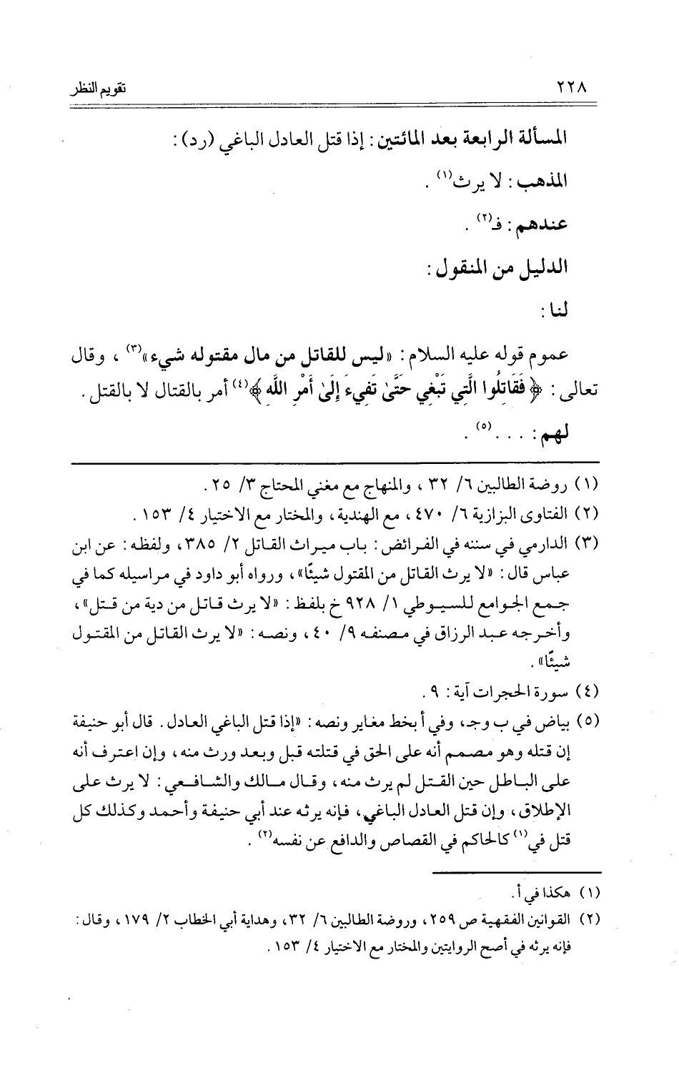 (الْمَسْأَلَة الرَّابِعَة بعد الْمِائَتَيْنِ: إِذا قتل الْعَادِل الْبَاغِي (ر د) :)