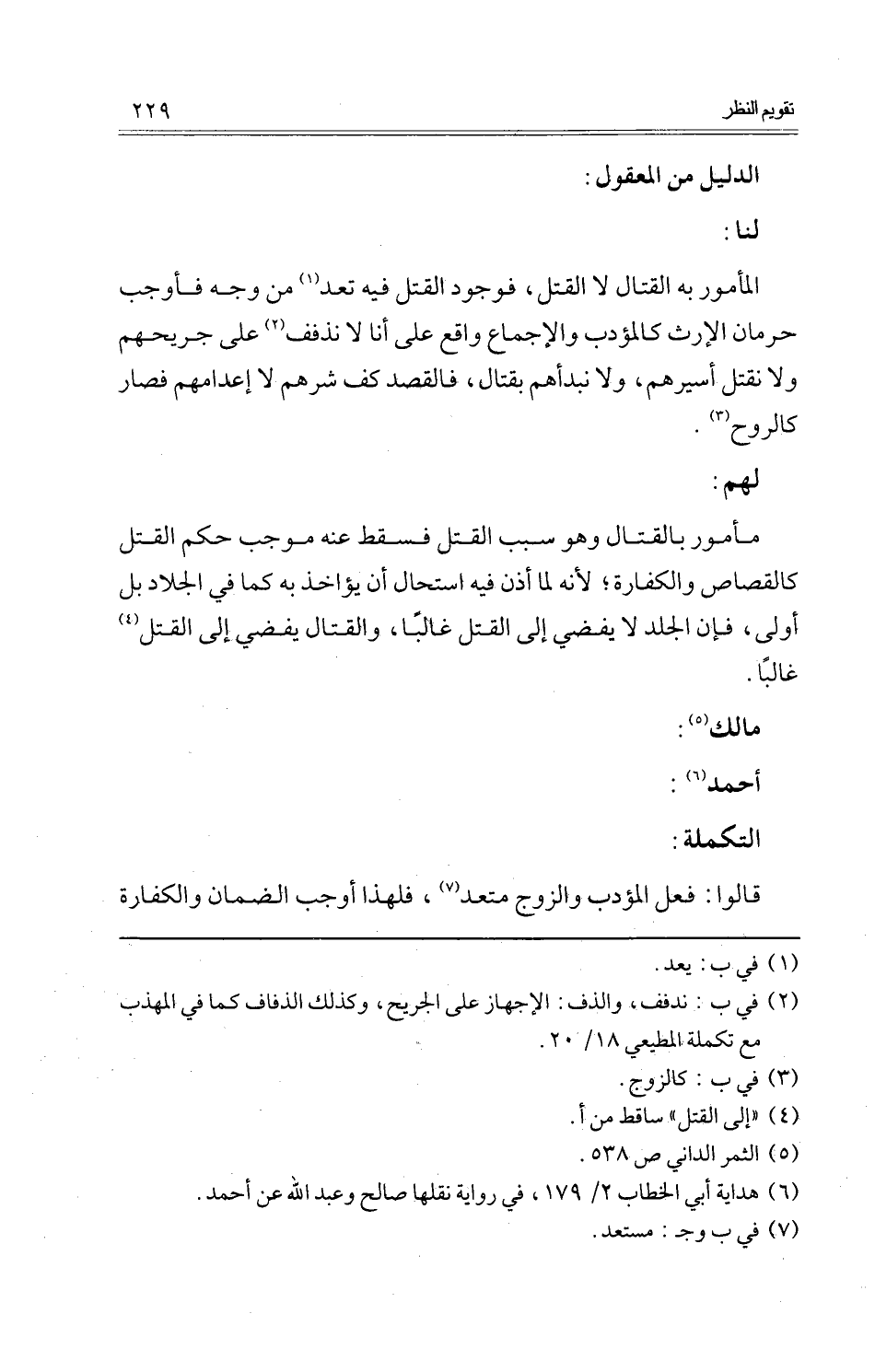 الْمَأْمُور بِهِ الْقِتَال لَا الْقَتْل، فوجود الْقَتْل فِيهِ تعد من وَجه فَأوجب حرمَان الْإِرْث كالمؤدب وَالْإِجْمَاع وَاقع على أَنا لَا نذفف على جريحهم وَلَا نقْتل أسيرهم، وَلَا نبدأهم بِقِتَال، فالقصد كف شرهم لَا إعدامهم فَصَارَ كالروح.