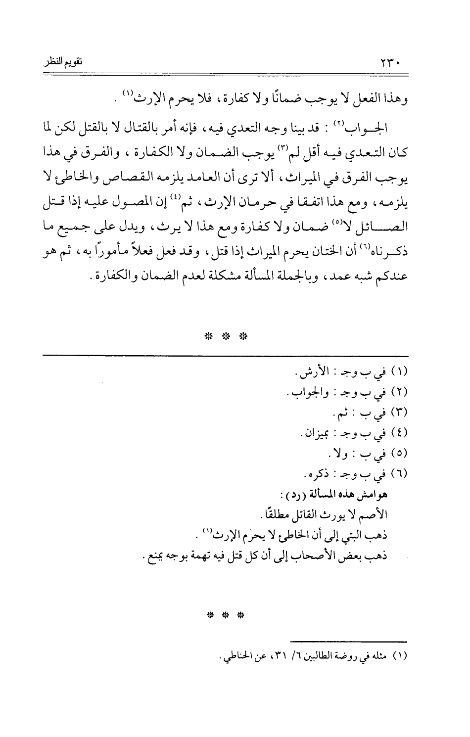 الْجَواب: قد بَينا وَجه التَّعَدِّي فِيهِ، فَإِنَّهُ أَمر بِالْقِتَالِ لَا بِالْقَتْلِ لَكِن لما كَانَ التَّعَدِّي فِيهِ أقل لم يُوجب الضَّمَان وَلَا الْكَفَّارَة، وَالْفرق فِي هَذَا يُوجب الْفرق فِي الْمِيرَاث، أَلا ترى أَن الْعَامِد يلْزمه الْقصاص والخاطئ لَا يلْزمه، وَمَعَ هَذَا اتفقَا فِي حرمَان الْإِرْث، ثمَّ إِن المصول عَلَيْهِ إِذا قتل الصَّائِل لَا ضَمَان وَلَا كَفَّارَة وَمَعَ هَذَا لَا يَرث، وَيدل على جَمِيع مَا ذَكرْنَاهُ أَن الْخِتَان يحرم الْمِيرَاث إِذا قتل، وَقد فعل فعلا مَأْمُورا بِهِ، ثمَّ هُوَ عنْدكُمْ شبه عمد، وَبِالْجُمْلَةِ الْمَسْأَلَة مشكلة لعدم الضَّمَان وَالْكَفَّارَة.