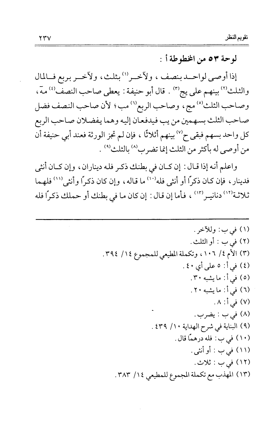 إِذا أوصى لوَاحِد بِنصْف، وَلآخر بِثلث، وَلآخر بِربع فَالْمَال وَالثلث بَينهم على يج. قَالَ أَبُو حنيفَة: يعْطى صَاحب النّصْف مَه، وَصَاحب الثُّلُث مج، وَصَاحب الرّبع مب؛ لِأَن صَاحب النّصْف فضل صَاحب الثُّلُث بسهمين من يب فيدفعان إِلَيْهِ وهما يفضلان صَاحب الرّبع كل وَاحِد بِسَهْم فبقى ح بَينهم أَثلَاثًا، فَإِن لم تجز الْوَرَثَة فَعِنْدَ أبي حنيفَة أَن من أوصى لَهُ بِأَكْثَرَ من الثُّلُث إِنَّمَا تضرب بِالثُّلثِ.