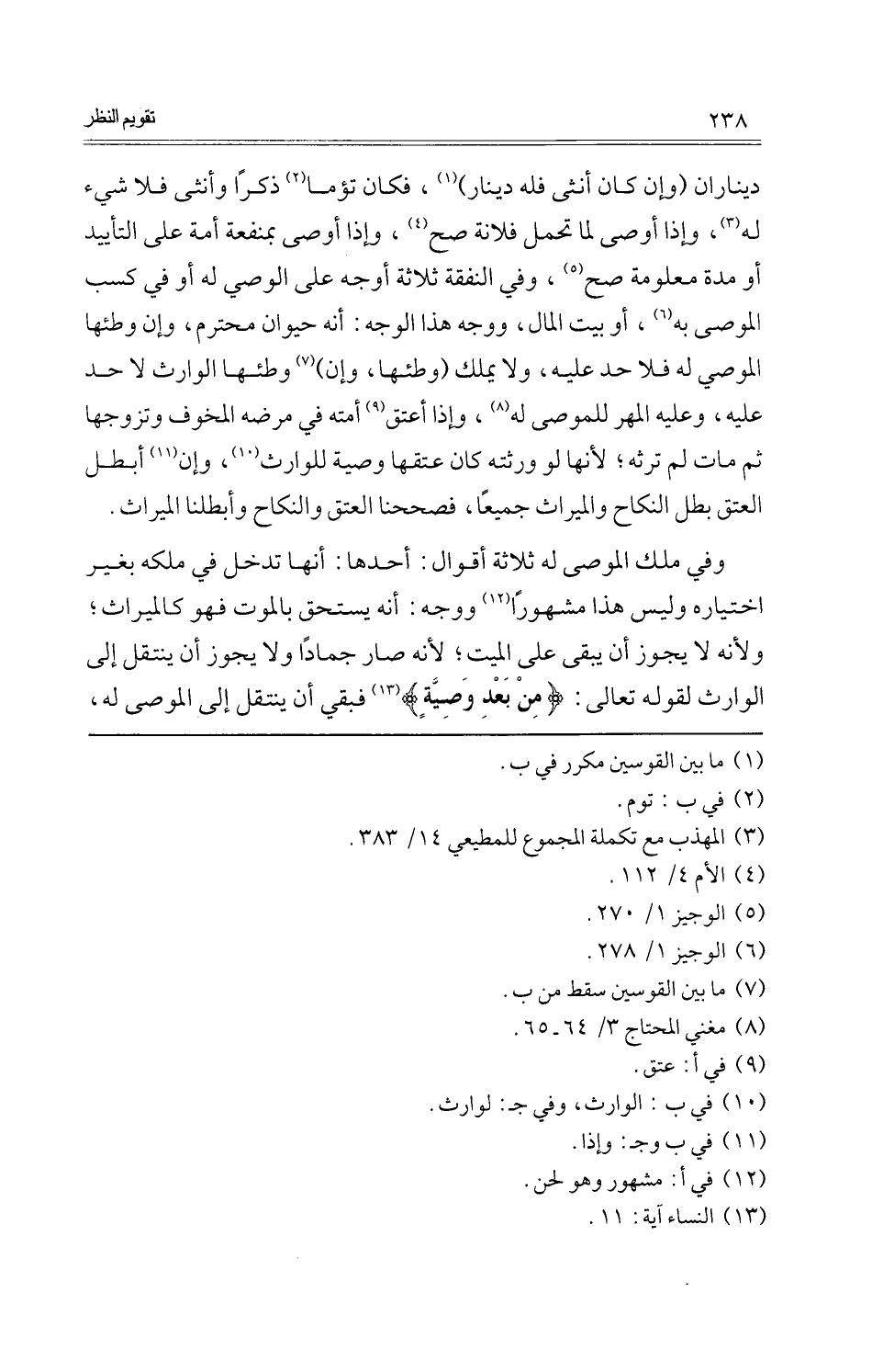 دِينَارَانِ (وَإِن كَانَ أُنْثَى فَلهُ دِينَار) ، فَكَانَ تؤما ذكرا وَأُنْثَى فَلَا شَيْء لَهُ، وَإِذا أوصى لما تحمل فُلَانَة صَحَّ، وَإِذا أوصى بِمَنْفَعَة أمة على التأييد أَو مُدَّة مَعْلُومَة صَحَّ، وَفِي النَّفَقَة ثَلَاثَة أوجه على الْوَصِيّ لَهُ أَو فِي كسب الْمُوصى بِهِ، أَو بَيت المَال، وَوجه هَذَا الْوَجْه: أَنه حَيَوَان مُحْتَرم، وَإِن وَطئهَا الْمُوصي لَهُ فَلَا حد عَلَيْهِ، وَلَا يملك (وَطئهَا، وَإِن) وَطئهَا الْوَارِث لَا حد عَلَيْهِ، وَعَلِيهِ الْمهْر للْمُوصى لَهُ، وَإِذا أعتق أمته فِي مَرضه الْمخوف وَتَزَوجهَا ثمَّ مَاتَ لم تَرثه؛ لِأَنَّهَا لَو ورثته كَانَ عتقهَا وَصِيَّة للْوَارِث، وَإِن أبطل الْعتْق بَطل النِّكَاح وَالْمِيرَاث جَمِيعًا، فصححنا الْعتْق وَالنِّكَاح وأبطلنا الْمِيرَاث.