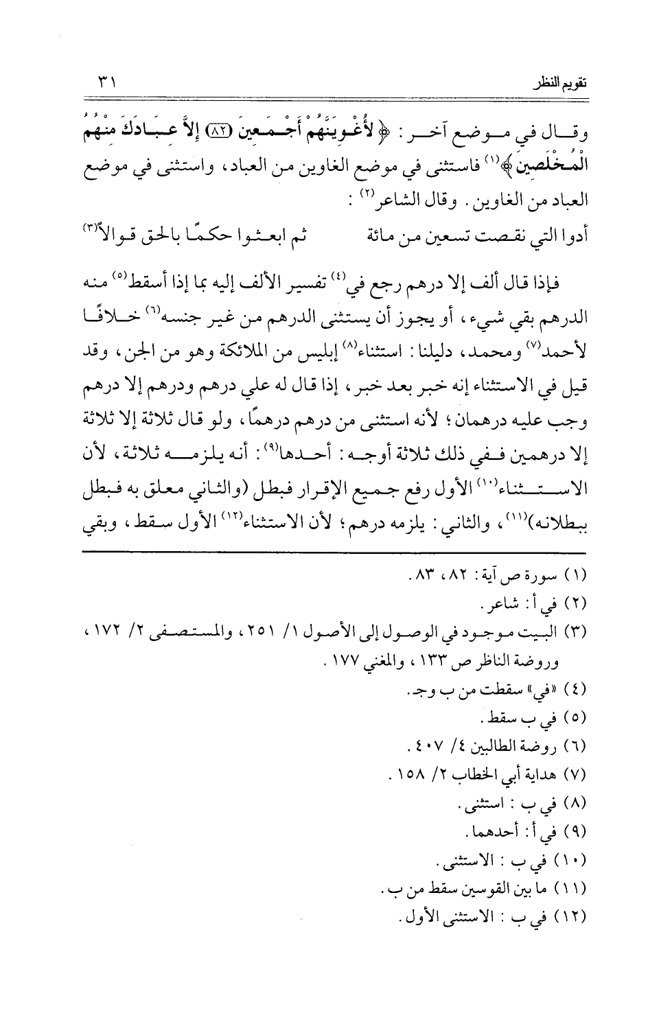 وَقَالَ فِي مَوضِع آخر: {لأغوينهم أَجْمَعِينَ (82) إِلَّا عِبَادك مِنْهُم المخلصين} فاستثنى فِي مَوضِع الغاوين من الْعباد، وَاسْتثنى فِي مَوضِع الْعباد من الغاوين. وَقَالَ الشَّاعِر:
