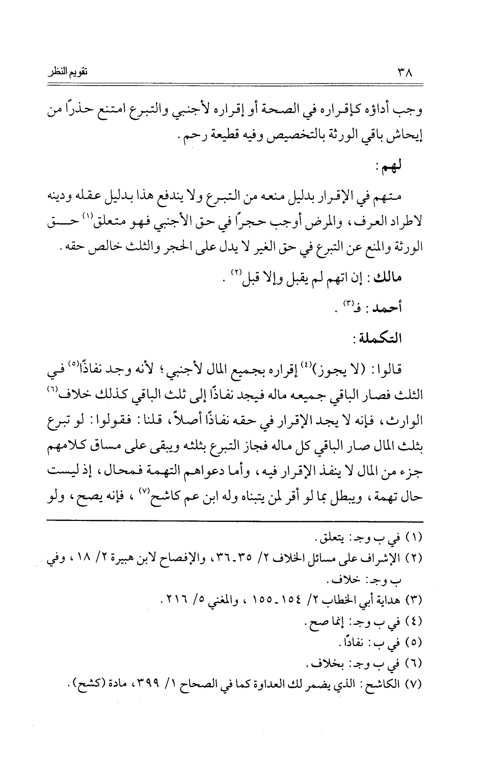 قَالُوا: (لَا يجوز) إِقْرَاره بِجَمِيعِ المَال لأَجْنَبِيّ؛ لِأَنَّهُ وجد نفاذا فِي الثُّلُث فَصَارَ الْبَاقِي جَمِيعه مَاله فيجد نفاذا إِلَى ثلث الْبَاقِي كَذَلِك خلاف الْوَارِث، فَإِنَّهُ لَا يجد الْإِقْرَار فِي حَقه نفاذا أصلا، قُلْنَا: فَقولُوا: لَو تبرع بِثلث المَال صَار الْبَاقِي كل مَاله فَجَاز التَّبَرُّع بِثُلثِهِ وَيبقى على مساق كَلَامهم جُزْء من المَال لَا ينفذ الْإِقْرَار فِيهِ، وَأما دَعوَاهُم التُّهْمَة فمحال، إِذْ لَيست حَال تُهْمَة، وَيبْطل بِمَا لَو أقرّ لمن يتبناه وَله ابْن عَم كاشح، فَإِنَّهُ يَصح، وَلَو