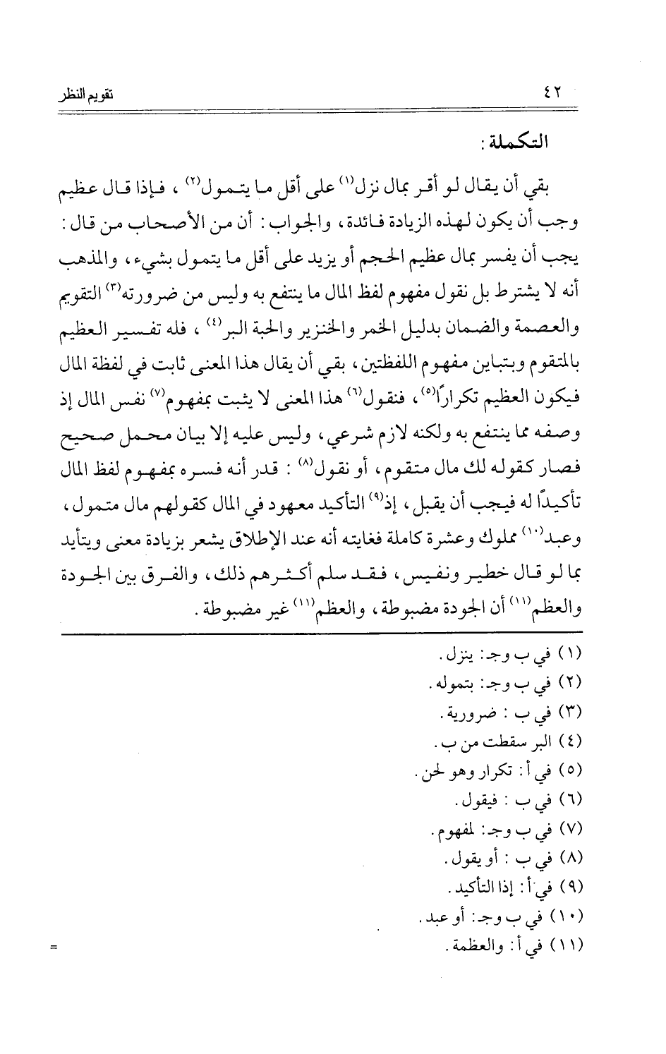 بَقِي أَن يُقَال لَو أقرّ بِمَال نزل على أقل مَا يتمول، فَإِذا قَالَ عَظِيم وَجب أَن يكون لهَذِهِ الزِّيَادَة فَائِدَة، وَالْجَوَاب: أَن من الْأَصْحَاب من قَالَ: يجب أَن يُفَسر بِمَال عَظِيم الحجم أَو يزِيد على أقل مَا يتمول بِشَيْء، وَالْمذهب أَنه لَا يشْتَرط بل نقُول مَفْهُوم لفظ المَال مَا ينْتَفع بِهِ وَلَيْسَ من ضَرُورَته التَّقْوِيم والعصمة وَالضَّمان بِدَلِيل الْخمر وَالْخِنْزِير والحبة الْبر، فَلهُ تَفْسِير الْعَظِيم بالمتقوم وبتباين مَفْهُوم اللفظتين، بَقِي أَن يُقَال هَذَا الْمَعْنى ثَابت فِي لَفْظَة المَال فَيكون الْعَظِيم تَكْرَارا، فَنَقُول هَذَا الْمَعْنى لَا يثبت بِمَفْهُوم نفس المَال إِذْ وَصفه مِمَّا ينْتَفع بِهِ وَلكنه لَازم شَرْعِي، وَلَيْسَ عَلَيْهِ إِلَّا بَيَان محمل صَحِيح فَصَارَ كَقَوْلِه لَك مَال مُتَقَوّم، أَو نقُول: قدر أَنه فسره بِمَفْهُوم لفظ المَال تَأْكِيدًا لَهُ فَيجب أَن يقبل، إِذْ التَّأْكِيد مَعْهُود فِي المَال كَقَوْلِهِم مَال مُتَمَوّل، وَعبد مَمْلُوك وَعشرَة كَامِلَة فغايته أَنه عِنْد الْإِطْلَاق يشْعر بِزِيَادَة معنى ويتأيد بِمَا لَو قَالَ خطير ونفيس، فقد سلم أَكْثَرهم ذَلِك، وَالْفرق بَين الْجَوْدَة والعظم أَن الْجَوْدَة مضبوطة، والعظم غير مضبوطة.