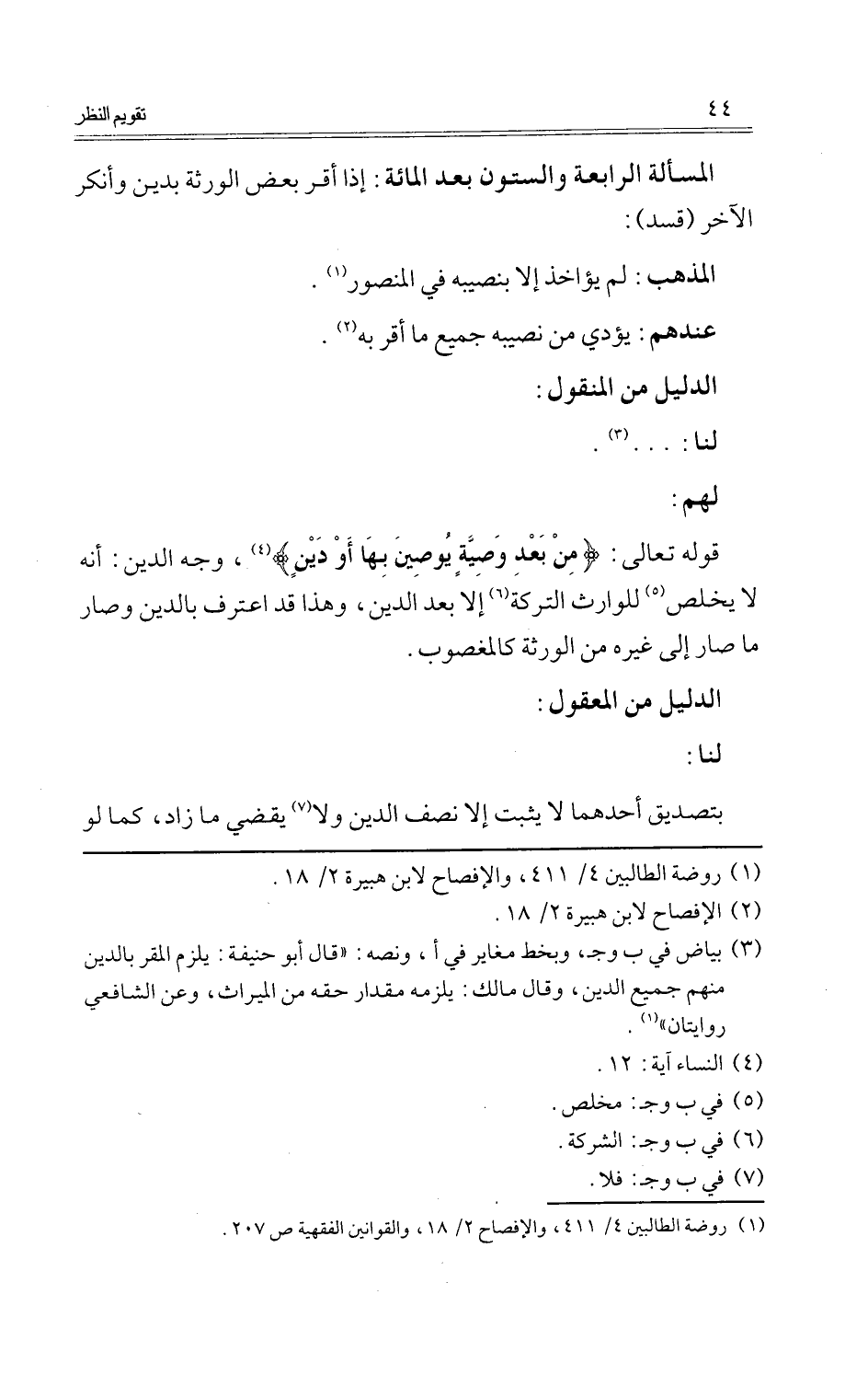 (الْمَسْأَلَة الرَّابِعَة وَالسِّتُّونَ بعد الْمِائَة: إِذا أقرّ بعض الْوَرَثَة بدين وَأنكر الآخر (قسد) :)