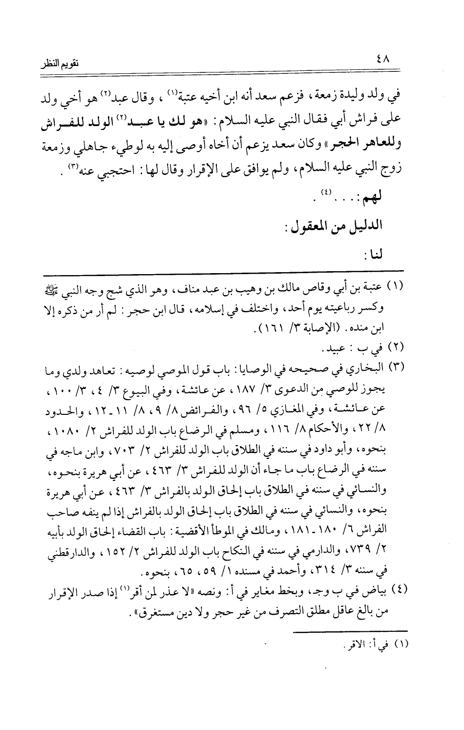 فِي ولد وليدة زَمعَة، فَزعم سعد أَنه ابْن أَخِيه عتبَة، وَقَالَ عبد هُوَ أخي ولد على فرَاش أبي فَقَالَ النَّبِي عَلَيْهِ السَّلَام: " هُوَ لَك يَا عبد الْوَلَد للْفراش وللعاهر الْحجر " وَكَانَ سعد يزْعم أَن أَخَاهُ أوصى إِلَيْهِ بِهِ لوطيء جاهلي وَزَمعَة زوج النَّبِي عَلَيْهِ السَّلَام، وَلم يُوَافق على الْإِقْرَار وَقَالَ لَهَا: احتجبي عَنهُ.