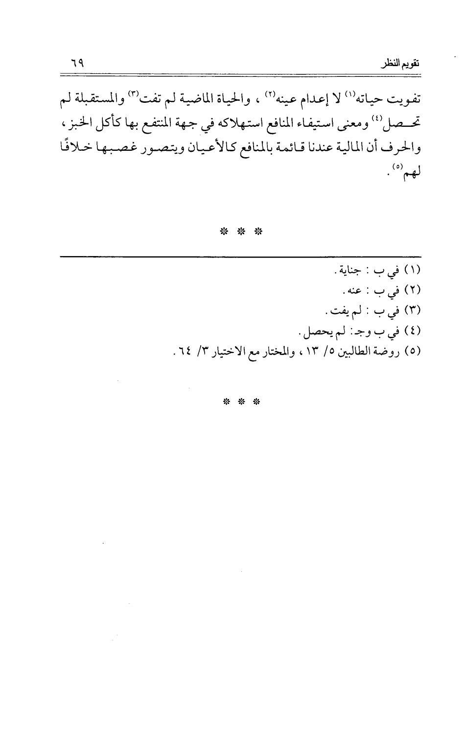 تَفْوِيت حَيَاته لَا إعدام عينه، والحياة الْمَاضِيَة لم تفت والمستقبلة لم تحصل وَمعنى اسْتِيفَاء الْمَنَافِع استهلاكه فِي جِهَة المنتفع بهَا كَأَكْل الْخبز، والحرف أَن الْمَالِيَّة عندنَا قَائِمَة بالمنافع كالأعيان وَيتَصَوَّر غصبهَا خلافًا لَهُم.
