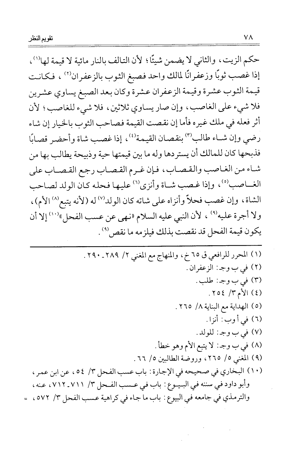 حكم الزَّيْت، وَالثَّانِي لَا يضمن شَيْئا؛ لِأَن التَّالِف بالنَّار مائية لَا قيمَة لَهَا، إِذا غصب ثوبا وزعفرانا لمَالِك وَاحِد فصبغ الثَّوْب بالزعفران، فَكَانَت قيمَة الثَّوْب عشرَة وَقِيمَة الزَّعْفَرَان عشرَة وَكَانَ بعد الصَّبْغ يُسَاوِي عشْرين فَلَا شَيْء على الْغَاصِب، وَإِن صَار يُسَاوِي ثَلَاثِينَ، فَلَا شَيْء للْغَاصِب؛ لِأَن أثر فعله فِي ملك غَيره فَأَما إِن نقصت الْقيمَة فَصَاحب الثَّوْب بِالْخِيَارِ إِن شَاءَ رَضِي وَإِن شَاءَ طَالب بِنُقْصَان الْقيمَة، إِذا غصب شَاة وأحضر قصابا فذبحها كَانَ للْمَالِك أَن يستردها وَله مَا بَين قيمتهَا حَيَّة وذبيحة يُطَالب بهَا من شَاءَ من الْغَاصِب والقصاب، فَإِن غرم القصاب رَجَعَ القصاب على الْغَاصِب، وَإِذا غصب شَاة وأنزى عَلَيْهَا فَحله كَانَ الْوَلَد لصَاحب الشَّاة، وَإِن غصب فحلا وأنزاه على شاته كَانَ الْوَلَد لَهُ (لِأَنَّهُ يتبع الْأُم) ، وَلَا أُجْرَة عَلَيْهِ، لِأَن النَّبِي عَلَيْهِ السَّلَام " نهى عَن عسب الْفَحْل " إِلَّا أَن يكون قيمَة الْفَحْل قد نقصت بذلك فَيلْزمهُ مَا نقص.