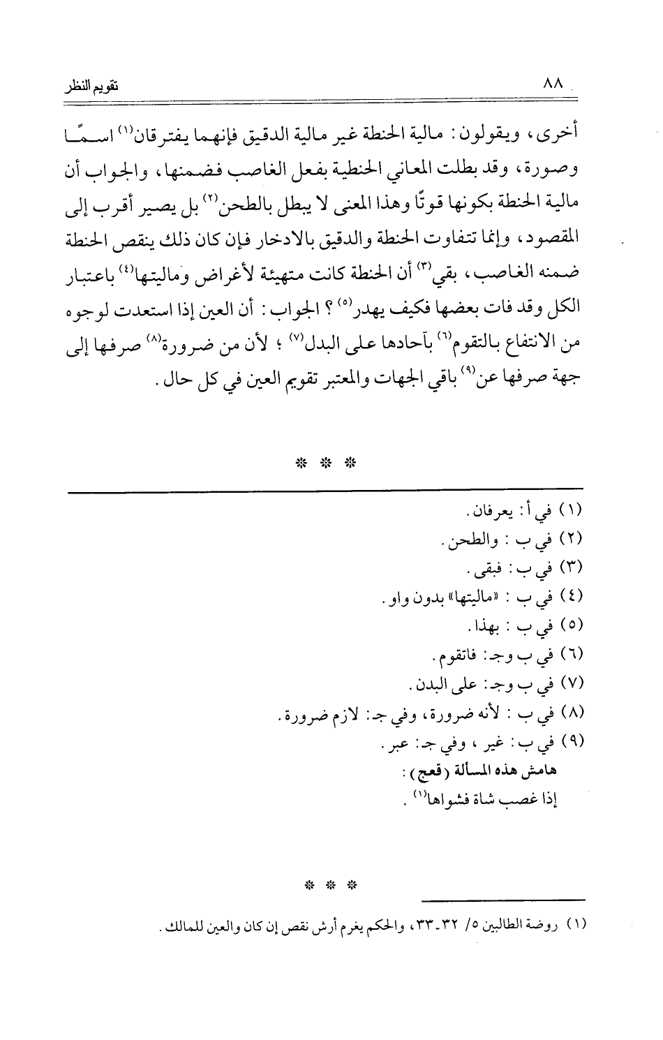 أُخْرَى، وَيَقُولُونَ: مَالِيَّة الْحِنْطَة غير مَالِيَّة الدَّقِيق فَإِنَّهُمَا يفترقان اسْما وَصُورَة، وَقد بطلت الْمعَانِي الحنطية بِفعل الْغَاصِب فضمنها، وَالْجَوَاب أَن مَالِيَّة الْحِنْطَة بِكَوْنِهَا قوتا وَهَذَا الْمَعْنى لَا يبطل بالطحن بل يصير أقرب إِلَى الْمَقْصُود، وَإِنَّمَا تَتَفَاوَت الْحِنْطَة والدقيق بالادخار فَإِن كَانَ ذَلِك ينقص الْحِنْطَة ضمنه الْغَاصِب، بَقِي أَن الْحِنْطَة كَانَت متهيئة لأغراض وماليتها بِاعْتِبَار الْكل وَقد فَاتَ بَعْضهَا فَكيف يهدر؟ الْجَواب: أَن الْعين إِذا استعدت لوجوه من الِانْتِفَاع بالتقوم بآحادها على الْبَدَل؛ لِأَن من ضَرُورَة صرفهَا إِلَى جِهَة صرفهَا عَن بَاقِي الْجِهَات وَالْمُعْتَبر تَقْوِيم الْعين فِي كل حَال.