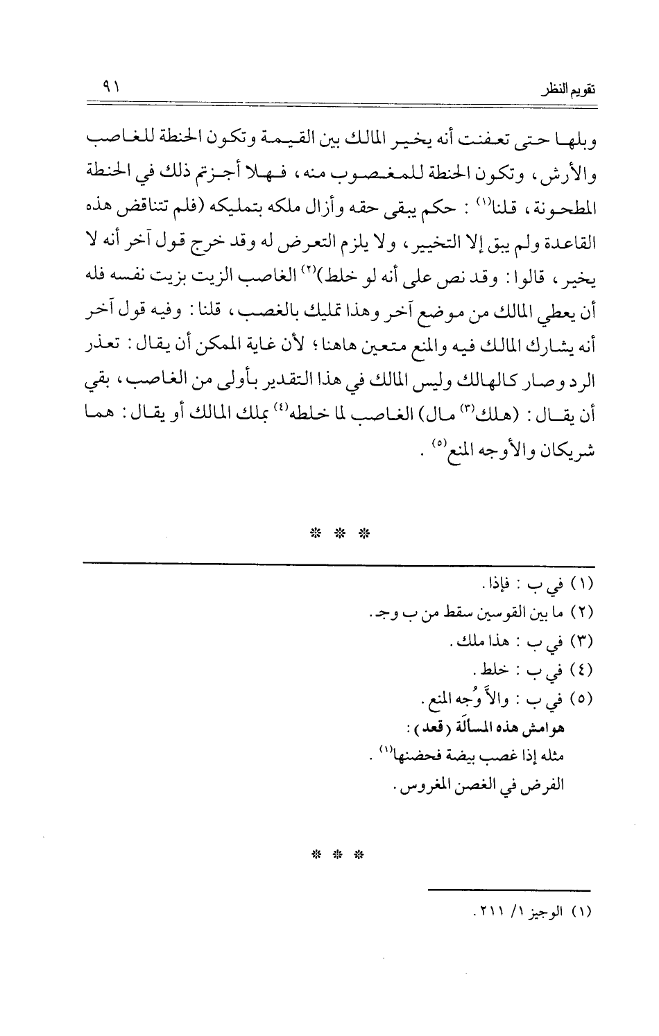 وبلها حَتَّى تعفنت أَنه يُخَيّر الْمَالِك بَين الْقيمَة وَتَكون الْحِنْطَة للْغَاصِب وَالْأَرْش، وَتَكون الْحِنْطَة للْمَغْصُوب مِنْهُ، فَهَلا أجزتم ذَلِك فِي الْحِنْطَة المطحونة، قُلْنَا: حكم يبْقى حَقه وأزال ملكه بتمليكه (فَلم تتناقض هَذِه الْقَاعِدَة وَلم يبْق إِلَّا التَّخْيِير، وَلَا يلْزم التَّعَرُّض لَهُ وَقد خرج قَول آخر أَنه لَا يُخَيّر، قَالُوا: وَقد نَص على أَنه لَو خلط) الْغَاصِب الزَّيْت بِزَيْت نَفسه فَلهُ أَن يُعْطي الْمَالِك من مَوضِع آخر وَهَذَا تمْلِيك بِالْغَصْبِ، قُلْنَا: وَفِيه قَول آخر أَنه يُشَارك الْمَالِك فِيهِ وَالْمَنْع مُتَعَيّن هَاهُنَا؛ لِأَن غَايَة الْمُمكن أَن يُقَال: تعذر الرَّد وَصَارَ كالهالك وَلَيْسَ الْمَالِك فِي هَذَا التَّقْدِير بِأولى من الْغَاصِب، بَقِي أَن يُقَال: (هلك مَال) الْغَاصِب لما خلطه بِملك الْمَالِك أَو يُقَال: هما شريكان وَالْأَوْجه الْمَنْع.