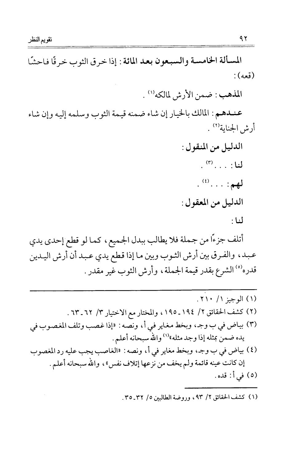 (الْمَسْأَلَة الْخَامِسَة وَالسَّبْعُونَ بعد الْمِائَة: إِذا خرق الثَّوْب خرقا فَاحِشا (قعه) :)