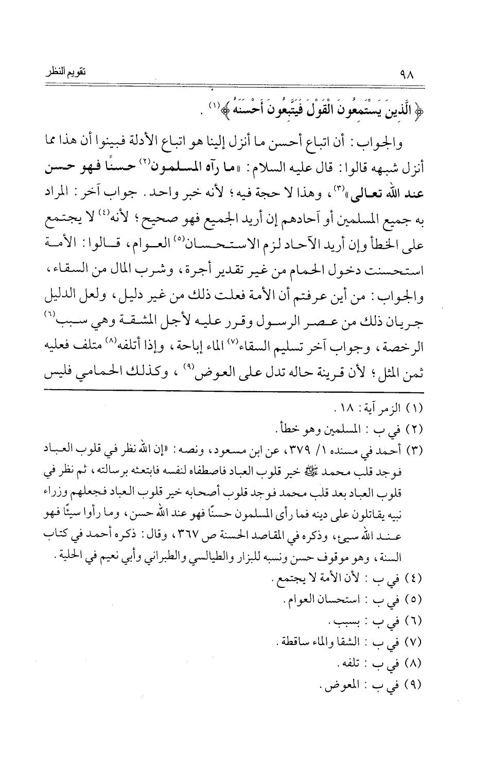 وَالْجَوَاب: أَن اتِّبَاع أحسن مَا أنزل إِلَيْنَا هُوَ اتِّبَاع الْأَدِلَّة فبينوا أَن هَذَا مِمَّا أنزل شبهه قَالُوا: قَالَ عَلَيْهِ السَّلَام: " مَا رَآهُ الْمُسلمُونَ حسنا فَهُوَ حسن عِنْد الله تَعَالَى "، وَهَذَا لَا حجَّة فِيهِ؛ لِأَنَّهُ خبر وَاحِد. جَوَاب آخر: المُرَاد بِهِ جَمِيع الْمُسلمين أَو آحادهم إِن أُرِيد الْجَمِيع فَهُوَ صَحِيح؛ لِأَنَّهُ لَا يجْتَمع على الْخَطَأ وَإِن أُرِيد الْآحَاد لزم الِاسْتِحْسَان الْعَوام، قَالُوا: الْأمة استحسنت دُخُول الْحمام من غير تَقْدِير أُجْرَة، وَشرب المَال من السقاء، وَالْجَوَاب: من أَيْن عَرَفْتُمْ أَن الْأمة فعلت ذَلِك من غير دَلِيل، وَلَعَلَّ الدَّلِيل جَرَيَان ذَلِك من عصر الرَّسُول وَقرر عَلَيْهِ لأجل الْمَشَقَّة وَهِي سَبَب الرُّخْصَة، وَجَوَاب آخر تَسْلِيم السقاء المَاء إِبَاحَة، وَإِذا أتْلفه متْلف فَعَلَيهِ ثمن الْمثل؛ لِأَن قرينَة حَاله تدل على الْعِوَض، وَكَذَلِكَ الحمامي فَلَيْسَ