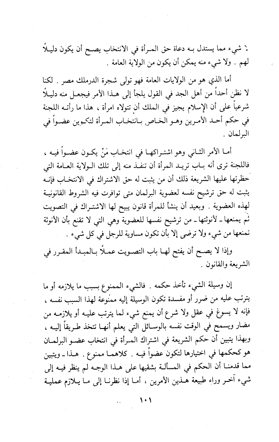 أما الأمر الثاني وهو اشتراكها في انتخاب من يكون عضوا فيه، فاللجنة ترى أنه باب تريد المرأة أن تنفذ منه إلى تلك الولاية العامة التي حظرتها عليها الشريعة ذلك أن من يثبت له حق الاشتراك في الانتخاب فإنه يثبت له حق ترشيح نفسه لعضوية البرلمان متى توافرت فيه الشروط القانونية لهذه العضوية. وبعيد أن ينشأ للمرأة قانون يبيح لها الاشتراك في التصويت ثم يمنعها-لأنوثتها-من ترشيح نفسها للعضوية وهي التي لا تقنع بأن الأنوثة تمنعها من شيء ولا ترضى إلا بأن تكون مساوية للرجل في كل شيء.