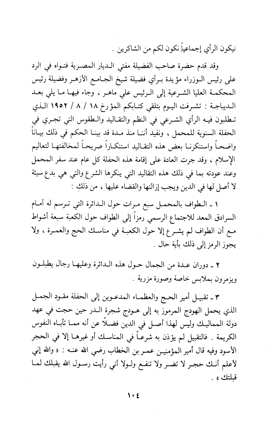 وقد قدم حضرة صاحب الفضيلة مفتي الديار المصرية فتواه في الرد على رئيس الوزراء مؤيدة برأي فضيلة شيخ الجامع الأزهر وفضيلة رئيس المحكمة العليا الشرعية إلى الرئيس علي ماهر، وجاء فيها ما يلي بعد الديباجة: تشرفت اليوم بتلقي كتابكم المؤرخ 18/ 8 / 1952 الذي تطلبون فيه الرأي الشرعي في النظم والتقاليد والطقوس التي تجري في الحفلة السنوية للمحمل، ونفيد أننا منذ مدة قد بينا الحكم في ذلك بيانا واضحا واستنكرنا بعض هذه التقاليد استنكارا صريحا لمخالفتها لتعاليم الإسلام، وقد جرت العادة على إقامة هذه الحفلة كل عام عند سفر المحمل وعند عودته بما في ذلك هذه التقاليد التي ينكرها الشرع والتي هي بدع سيئة لا أصل لها في الدين ويجب إزالتها والقضاء عليها، من ذلك: