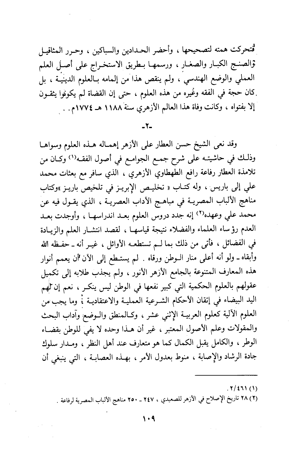 وقد نعى الشيخ حسن العطار على الأزهر إهماله هذه العلوم وسواها وذلك في حاشيته على شرح جمع الجوامع في أصول الفقه 1 وكان من تلامذة العطار رفاعة رافع الطهطاوي الأزهري، الذي سافر مع بعثات محمد علي إلى باريس، وله كتاب «تخليص الإبريز في تلخيص باريز» وكتاب مناهج الألباب المصرية في مباهج الآداب العصرية، الذي يقول فيه عن محمد علي وعهده 2إنه جدد دروس العلوم بعد اندراسها، وأوجدت بعد العدم رؤساء العلماء والفضلاء نتيجة قياسها، لقصد انتشار العلم والزيادة في الفضائل، فأتى من ذلك بما لم تستطعه الأوائل، غير أنه-حفظه اللّه وأبقاه-و لو أنه أعلى منار الوطن ورقاه. لم يستطع إلى الآن أن يعمم أنوار هذه المعارف المتنوعة بالجامع الأزهر الأنور، ولم يجذب طلابه إلى تكميل عقولهم بالعلوم الحكمية التي كبير نفعها في الوطن ليس ينكر، نعم إن لهم اليد البيضاء في إتقان الأحكام الشرعية العملية والاعتقادية، وما يجب من العلوم الآلية كعلوم العربية الإثني عشر، وكالمنطق والوضع وآداب البحث والمقولات وعلم الأصول المعتبر، غير أن هذا وحده لا يفي للوطن بقضاء الوطر، والكامل يقبل الكمال كما هو متعارف عند أهل النظر، ومدار سلوك جادة الرشاد والإصابة، منوط بعدول الأمر، بهذه العصابة، التي ينبغي أن