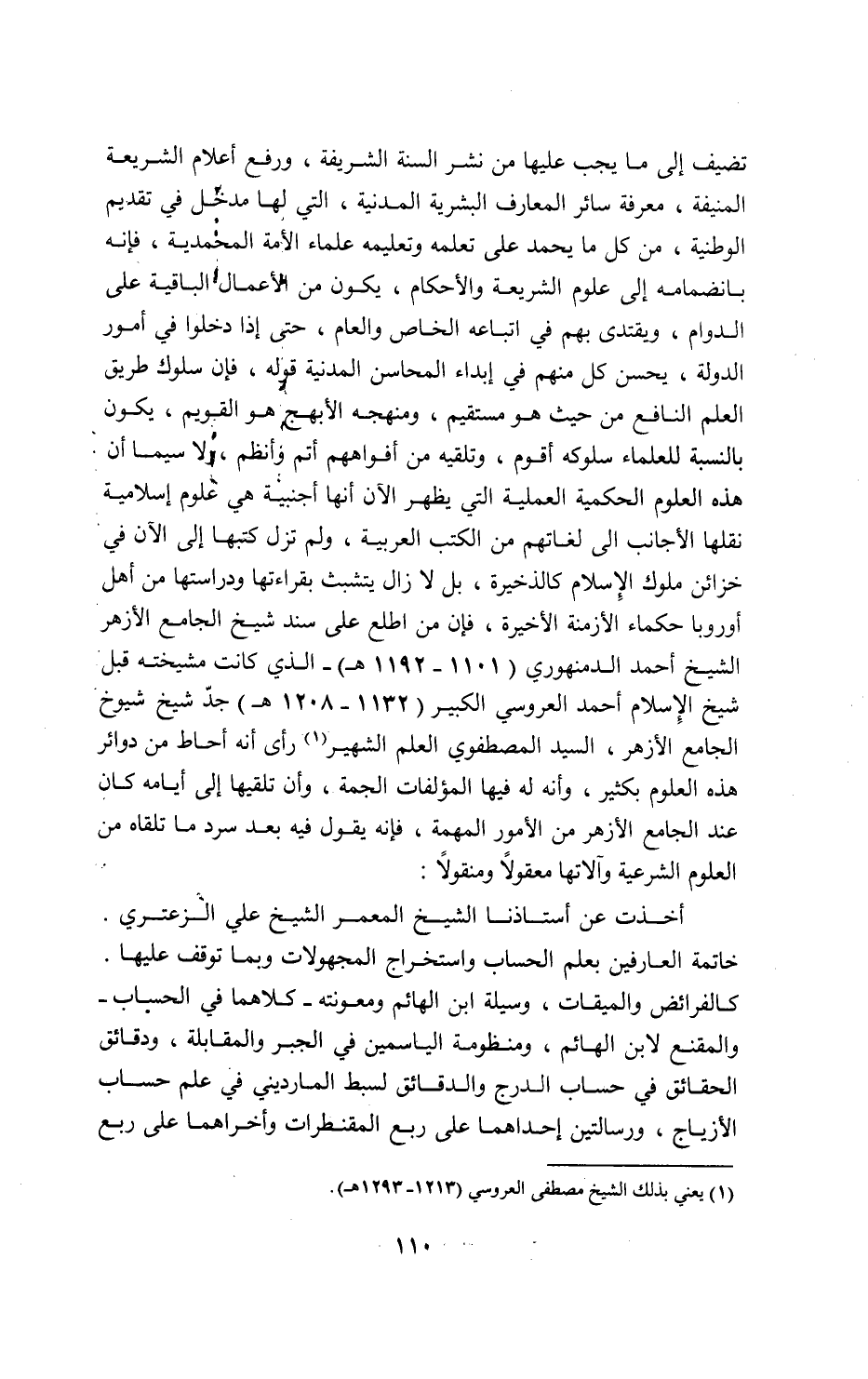 تضيف إلى ما يجب عليها من نشر السنة الشريفة، ورفع أعلام الشريعة المنيفة، معرفة سائر المعارف البشرية المدنية، التي لها مدخل في تقديم الوطنية، من كل ما يحمد على تعلمه وتعليمه علماء الأمة المحمدية، فإنه بانضمامه إلى علوم الشريعة والأحكام، يكون من الأعمال الباقية على الدوام، ويقتدى بهم في اتباعه الخاص والعام، حتى إذا دخلوا في أمور الدولة، يحسن كل منهم في إبداء المحاسن المدنية قوله، فإن سلوك طريق العلم النافع من حيث هو مستقيم، ومنهجه الأبهج هو القويم، يكون بالنسبة للعلماء سلوكه أقوم، وتلقيه من أفواههم أتم وأنظم، لا سيما أن هذه العلوم الحكمية العملية التي يظهر الآن أنها أجنبية هي علوم إسلامية نقلها الأجانب الى لغاتهم من الكتب العربية، ولم تزل كتبها إلى الآن في خزائن ملوك الإسلام كالذخيرة، بل لا زال يتشبث بقراءتها ودراستها من أهل أوروبا حكماء الأزمنة الأخيرة، فإن من اطلع على سند شيخ الجامع الأزهر الشيخ أحمد الدمنهوري (1101 - 1192 ه) -الذي كانت مشيخته قبل شيخ الإسلام أحمد العروسي الكبير (1132 - 1208 ه) جدّ شيخ شيوخ الجامع الأزهر، السيد المصطفوي العلم الشهير 1رأى أنه أحاط من دوائر هذه العلوم بكثير، وأنه له فيها المؤلفات الجمة، وأن تلقيها إلى أيامه كان عند الجامع الأزهر من الأمور المهمة، فإنه يقول فيه بعد سرد ما تلقاه من العلوم الشرعية وآلاتها معقولا ومنقولا: