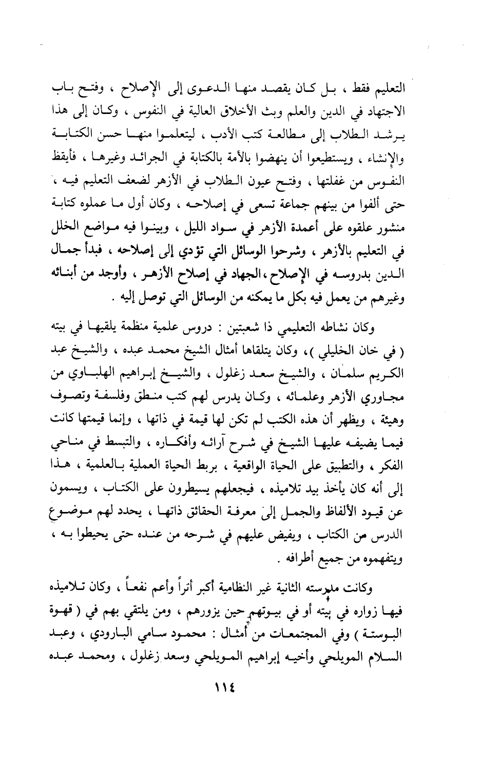 التعليم فقط، بل كان يقصد منها الدعوى إلى الإصلاح، وفتح باب الاجتهاد في الدين والعلم وبث الأخلاق العالية في النفوس، وكان إلى هذا يرشد الطلاب إلى مطالعة كتب الأدب، ليتعلموا منها حسن الكتابة والإنشاء، ويستطيعوا أن ينهضوا بالأمة بالكتابة في الجرائد وغيرها، فأيقظ النفوس من غفلتها، وفتح عيون الطلاب في الأزهر لضعف التعليم فيه، حتى ألفوا من بينهم جماعة تسعى في إصلاحه، وكان أول ما عملوه كتابة منشور علقوه على أعمدة الأزهر في سواد الليل، وبينوا فيه مواضع الخلل في التعليم بالأزهر، وشرحوا الوسائل التي تؤدي إلى إصلاحه، فبدأ جمال الدين بدروسه في الإصلاح، الجهاد في إصلاح الأزهر، وأوجد من أبنائه وغيرهم من يعمل فيه بكل ما يمكنه من الوسائل التي توصل إليه.