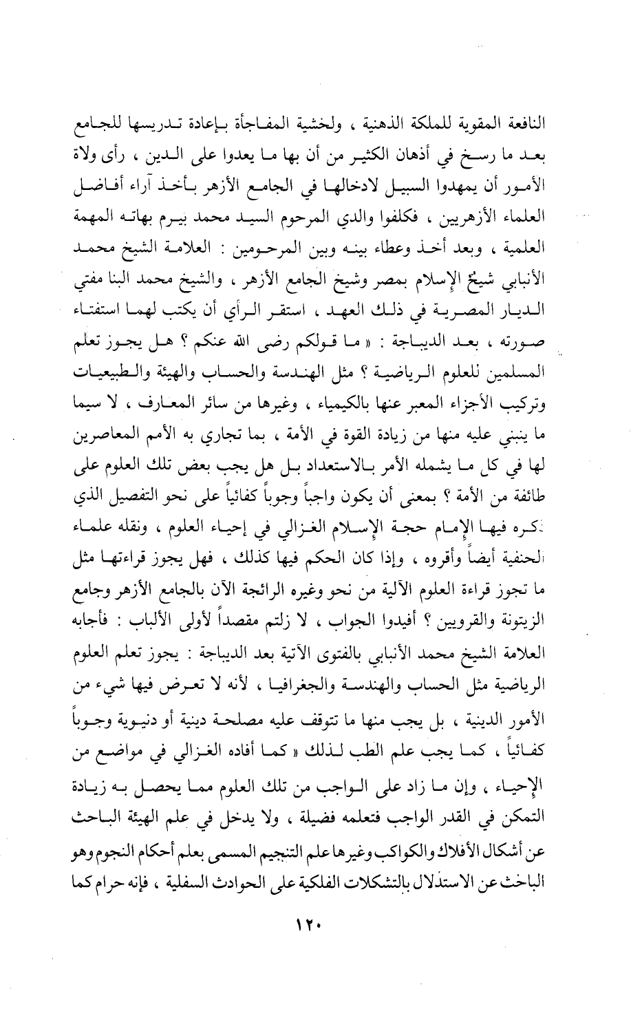 النافعة المقوية للملكة الذهنية، ولخشية المفاجأة بإعادة تدريسها للجامع بعد ما رسخ في أذهان الكثير من أن بها ما يعدوا على الدين، رأى ولاة الأمور أن يمهدوا السبيل لادخالها في الجامع الأزهر بأخذ آراء أفاضل العلماء الأزهريين، فكلفوا والدي المرحوم السيد محمد بيرم بهاته المهمة العلمية، وبعد أخذ وعطاء بينه وبين المرحومين: العلامة الشيخ محمد الأنبابي شيخ الإسلام بمصر وشيخ الجامع الأزهر، والشيخ محمد البنا مفتي الديار المصرية في ذلك العهد، استقر الرأي أن يكتب لهما استفتاء صورته، بعد الديباجة: «ما قولكم رضى اللّه عنكم؟ هل يجوز تعلم المسلمين للعلوم الرياضية؟ مثل الهندسة والحساب والهيئة والطبيعيات وتركيب الأجزاء المعبر عنها بالكيمياء، وغيرها من سائر المعارف، لا سيما ما ينبني عليه منها من زيادة القوة في الأمة، بما تجاري به الأمم المعاصرين لها في كل ما يشمله الأمر بالاستعداد بل هل يجب بعض تلك العلوم على طائفة من الأمة؟ بمعنى أن يكون واجبا وجوبا كفائيا على نحو التفصيل الذي ذكره فيها الإمام حجة الإسلام الغزالي في إحياء العلوم، ونقله علماء الحنفية أيضا وأقروه، وإذا كان الحكم فيها كذلك، فهل يجوز قراءتها مثل ما تجوز قراءة العلوم الآلية من نحو وغيره الرائجة الآن بالجامع الأزهر وجامع الزيتونة والقرويين؟ أفيدوا الجواب، لا زلتم مقصدا لأولى الألباب: فأجابه العلامة الشيخ محمد الأنبابي بالفتوى الآتية بعد الديباجة: يجوز تعلم العلوم الرياضية مثل الحساب والهندسة والجغرافيا، لأنه لا تعرض فيها شيء من الأمور الدينية، بل يجب منها ما تتوقف عليه مصلحة دينية أو دنيوية وجوبا كفائيا، كما يجب علم الطب لذلك «كما أفاده الغزالي في مواضع من الإحياء، وإن ما زاد على الواجب من تلك العلوم مما يحصل به زيادة التمكن في القدر الواجب فتعلمه فضيلة، ولا يدخل في علم الهيئة الباحث عن أشكال الأفلاك والكواكب وغيرها علم التنجيم المسمى بعلم أحكام النجوم وهو الباحث عن الاستدلال بالتشكلات الفلكية على الحوادث السفلية، فإنه حرام كما