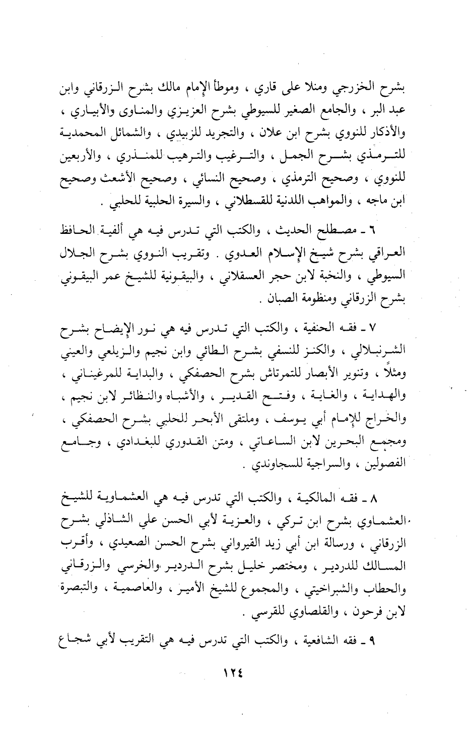 7 - فقه الحنفية، والكتب التي تدرس فيه هي نور الإيضاح بشرح الشرنبلالي، والكنز للنسفي بشرح الطائي وابن نجيم والزيلعي والعيني ومثلا، وتنوير الأبصار للتمرتاش بشرح الحصفكي، والبداية للمرغيناني، والهداية، والغاية، وفتح القدير، والأشباه والنظائر لابن نجيم، والخراج للإمام أبي يوسف، وملتقى الأبحر للحلبي بشرح الحصفكي، ومجمع البحرين لابن الساعاتي، ومتن القدوري للبغدادي، وجامع الفصولين، والسراجية للسجاوندي.