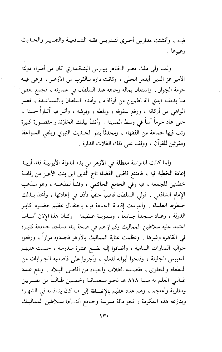 ولما كانت الدراسة معطلة في الأزهر من بدء الدولة الأيوبية فقد أريد إعادة الخطبة فيه، فامتنع قاضي القضاة تاج الدين ابن بنت الأعز من إقامة خطبتين للجمعة، فيه وفي الجامع الحاكمي، وفقا لمذهبه، وهو مذهب الإمام الشافعي. فولي السلطان قاضيا حنفيا فأذن في إعادتها، وأخذ بذلك خطوط العلماء. وأعيدت إقامة الجمعة فيه باحتفال عظيم حضره أكابر الدولة، وعاد مسجدا جامعا، ومدرسة عظيمة. وكان هذا الإذن أساسا اعتمد عليه سلاطين المماليك وكبراؤهم في صحة بناء مساجد جامعة كثيرة في القاهرة وغيرها. وعظمت عناية المماليك بالأزهر فجددوه مرارا، ورفعوا حواليه المنارات السامية، وأضافوا إليه بضع عشرة مدرسة، حبست عليها الحبوس الجليلة، وفتحوا أبوابه للعلم، وأجروا على قاصديه الجرايات من الطعام والحلوى، فقصده الطلاب والعباد من أقاصي البلاد. وبلغ عدد طالبي العلم به سنة 818 ه نحو سبعمائة وخمسين طالبا من مصريين ومغاربة وأعاجم، وهم عدد عظيم بالإضافة إلى ما كان ينافسه في الشهرة وينازعه هذه المكرمة، نحو مائة مدرسة وجامع أنشأها سلاطين المماليك