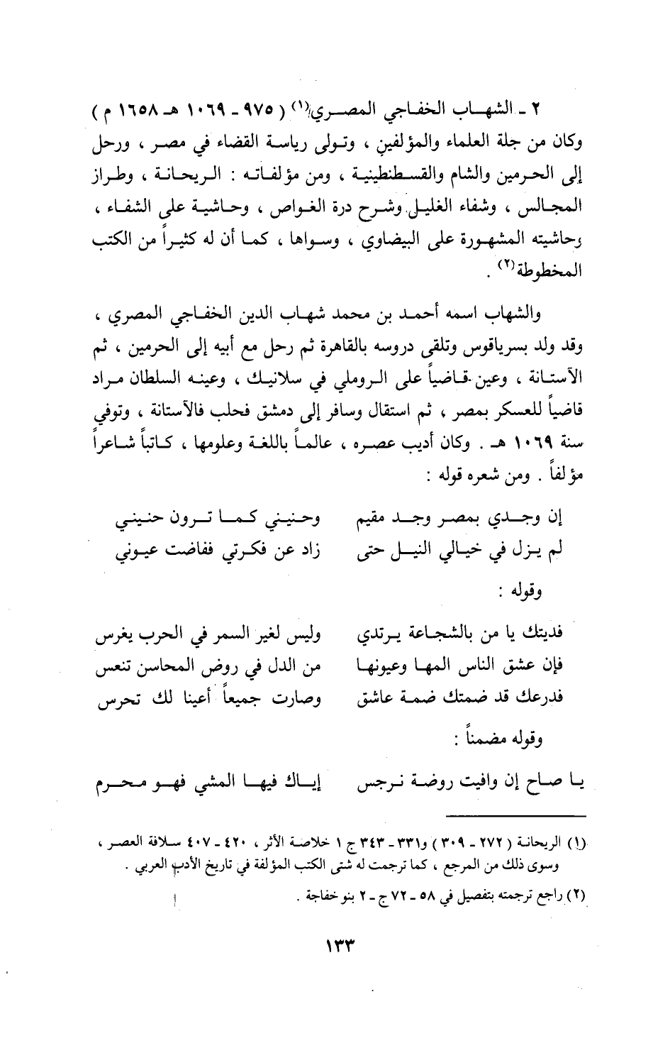 2 - الشهاب الخفاجي المصري 1 (975 - 1069 ه 1658 م) وكان من جلة العلماء والمؤلفين، وتولى رياسة القضاء في مصر، ورحل إلى الحرمين والشام والقسطنطينية، ومن مؤلفاته: الريحانة، وطراز المجالس، وشفاء الغليل وشرح درة الغواص، وحاشية على الشفاء، وحاشيته المشهورة على البيضاوي، وسواها، كما أن له كثيرا من الكتب المخطوطة 2.