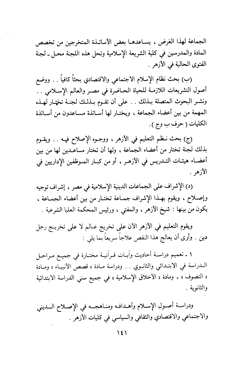 (ج) بحث نظم التعليم في الأزهر، ووجوه الإصلاح فيه. . ويقوم بذلك لجنة تختار من أعضاء الجماعة، ولها أن تختار مساعدين لها من بين أعضاء هيئات التدريس في الأزهر، أو من كبار الموظفين الإداريين في الأزهر.