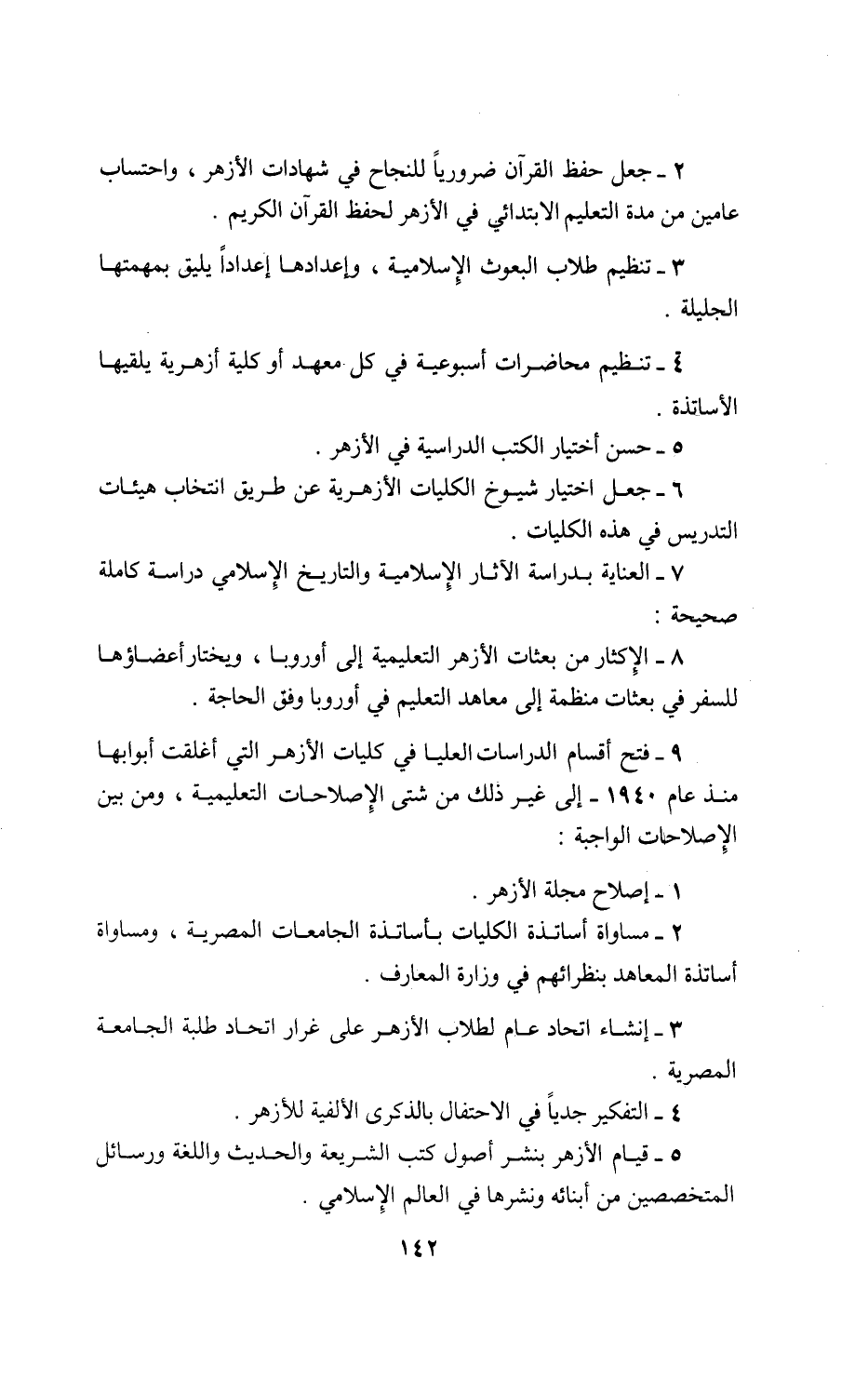 9 - فتح أقسام الدراسات العليا في كليات الأزهر التي أغلقت أبوابها منذ عام 1940 - إلى غير ذلك من شتى الإصلاحات التعليمية، ومن بين الإصلاحات الواجبة: