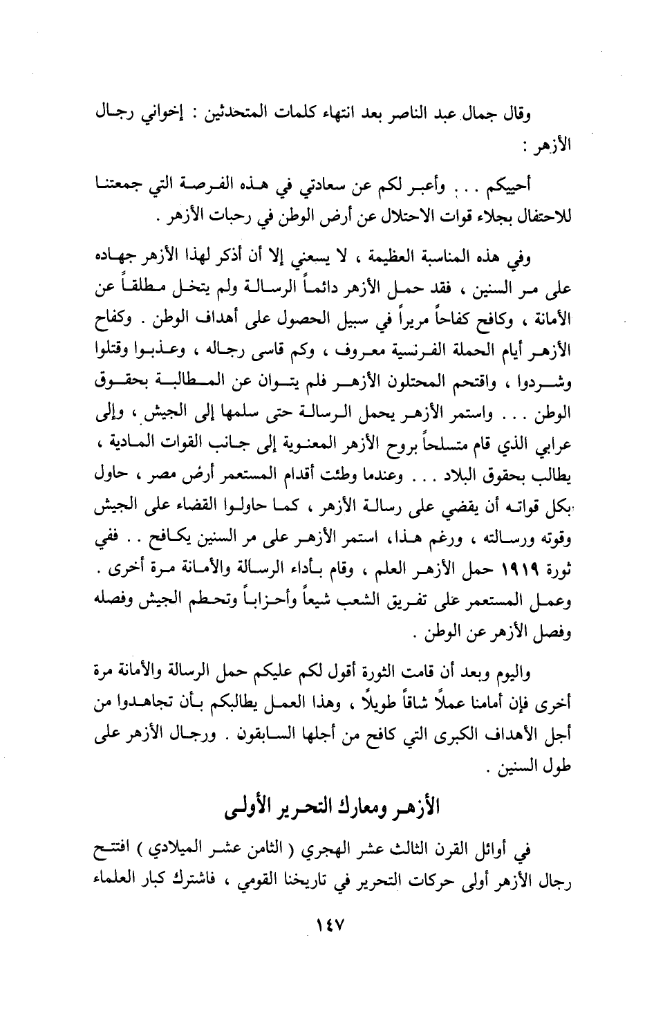 وفي هذه المناسبة العظيمة، لا يسعني إلا أن أذكر لهذا الأزهر جهاده على مر السنين، فقد حمل الأزهر دائما الرسالة ولم يتخل مطلقا عن الأمانة، وكافح كفاحا مريرا في سبيل الحصول على أهداف الوطن. وكفاح الأزهر أيام الحملة الفرنسية معروف، وكم قاسى رجاله، وعذبوا وقتلوا وشردوا، واقتحم المحتلون الأزهر فلم يتوان عن المطالبة بحقوق الوطن. . . واستمر الأزهر يحمل الرسالة حتى سلمها إلى الجيش، وإلى عرابي الذي قام متسلحا بروح الأزهر المعنوية إلى جانب القوات المادية، يطالب بحقوق البلاد. . . وعند ما وطئت أقدام المستعمر أرض مصر، حاول بكل قواته أن يقضي على رسالة الأزهر، كما حاولوا القضاء على الجيش وقوته ورسالته، ورغم هذا، استمر الأزهر على مر السنين يكافح. . ففي ثورة 1919 حمل الأزهر العلم، وقام بأداء الرسالة والأمانة مرة أخرى.