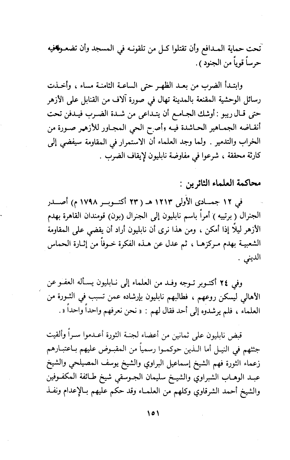 في 12 جمادى الأولى 1213 ه (23 أكتوبر 1798 م) أصدر الجنرال (برتييه) أمرا باسم نابليون إلى الجنرال (بون) قومندان القاهرة بهدم الأزهر ليلا إذا أمكن، ومن هذا نرى أن نابليون أراد أن يقضي على المقاومة الشعبية بهدم مركزها، ثم عدل عن هذه الفكرة خوفا من إثارة الحماس الديني.