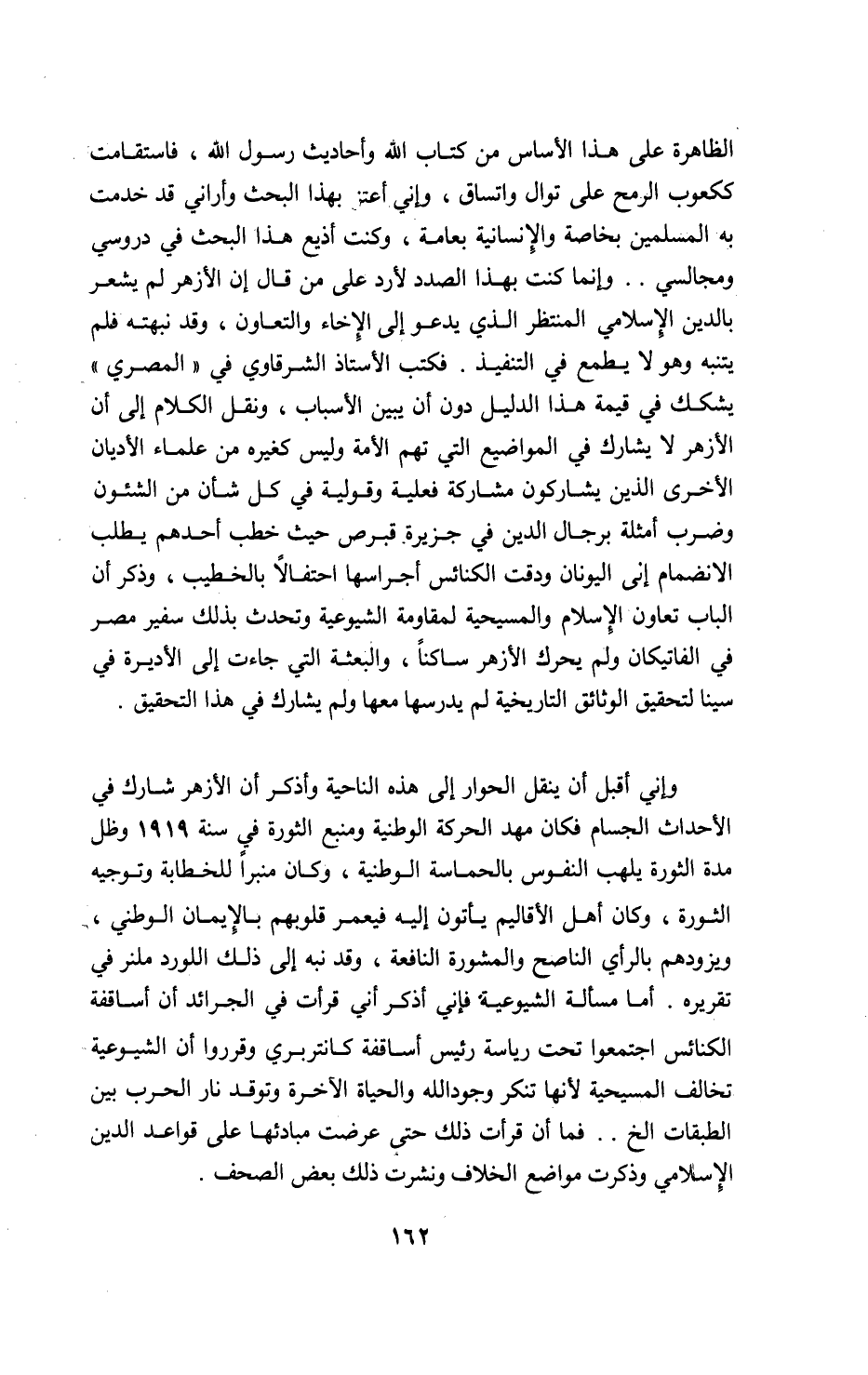 وإني أقبل أن ينقل الحوار إلى هذه الناحية وأذكر أن الأزهر شارك في الأحداث الجسام فكان مهد الحركة الوطنية ومنبع الثورة في سنة 1919 وظل مدة الثورة يلهب النفوس بالحماسة الوطنية، وكان منبرا للخطابة وتوجيه الثورة، وكان أهل الأقاليم يأتون إليه فيعمر قلوبهم بالإيمان الوطني، ويزودهم بالرأي الناصح والمشورة النافعة، وقد نبه إلى ذلك اللورد ملنر في تقريره. أما مسألة الشيوعية فإني أذكر أني قرأت في الجرائد أن أساقفة الكنائس اجتمعوا تحت رياسة رئيس أساقفة كانتربري وقرروا أن الشيوعية تخالف المسيحية لأنها تنكر وجود الله والحياة الآخرة وتوقد نار الحرب بين الطبقات الخ. . فما أن قرأت ذلك حتى عرضت مبادئها على قواعد الدين الإسلامي وذكرت مواضع الخلاف ونشرت ذلك بعض الصحف.