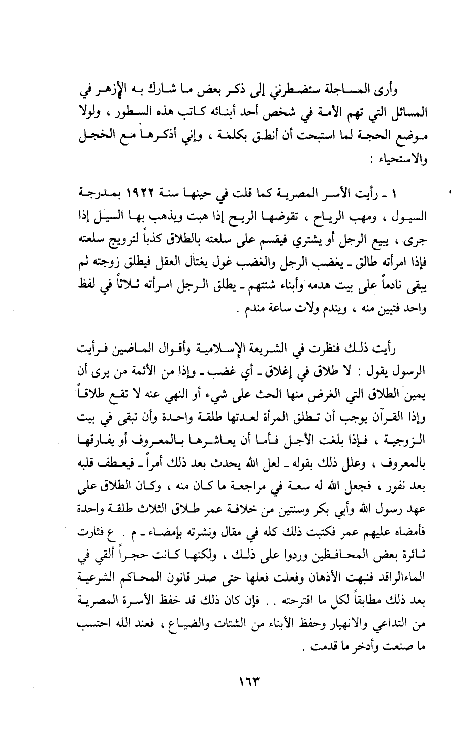 1 - رأيت الأسر المصرية كما قلت في حينها سنة 1922 بمدرجة السيول، ومهب الرياح، تقوضها الريح إذا هبت ويذهب بها السيل إذا جرى، يبيع الرجل أو يشتري فيقسم على سلعته بالطلاق كذبا لترويج سلعته فإذا امرأته طالق-يغضب الرجل والغضب غول يغتال العقل فيطلق زوجته ثم يبقى نادما على بيت هدمه وأبناء شتتهم-يطلق الرجل امرأته ثلاثا في لفظ واحد فتبين منه، ويندم ولات ساعة مندم.